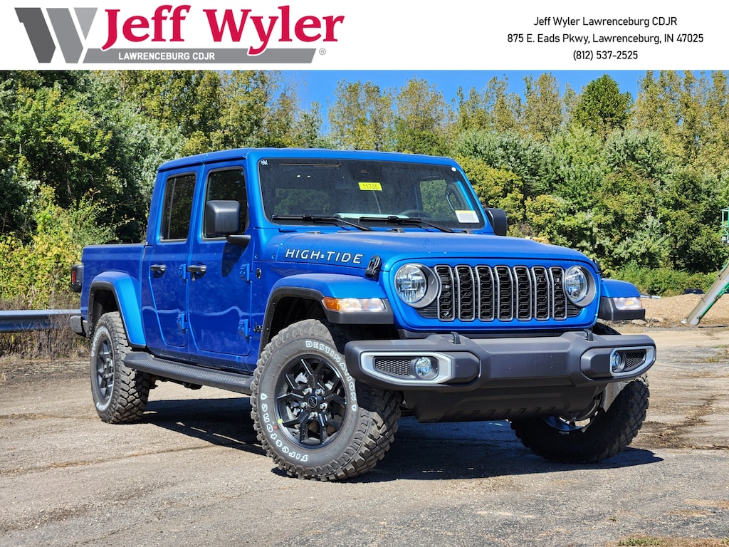 Jeff Wyler Chrysler Dodge Jeep of Lawrenceburg is pleased to offer this great-looking 2025 Jeep Gladiator in Hydro Blue Pearlcoat. Well equipped with: Convenience Group (Corning Gorilla Glass, Daytime Running Lamp System, Emergency/Assistance Call, Front Door Locks 2-Door Passive Entry, Heated Front Seats, Heated Steering Wheel, Remote Start System, and Universal Garage Door Opener), Quick Order Package 24Q High Tide (97 MPH Vehicle Max Speed Calibration, Advanced Brake Assist, Automatic Headlamps, Body Color 3-Piece Hard Top, Body Color Fender Flares (2-Piece), Deep Tint Sunscreen Windows, Freedom Panel Storage Bag, Full Length Floor Console Premium Armrest, Full Speed Forward Collision Warning Plus, Hard Seat Back, High Tide, High Tide Tailgate & Hood Decals, Integrated Radar Camera Module (IRCM), Leather Wrapped Park Brake Handle, Leather Wrapped Shift Knob, Power 4-Way Driver Lumbar Adjust, Power 4-Way Passenger Lumbar Adjust, Power Adjust 8-Way Driver Seat, Power Adjust 8-Way Front Passenger Seat, Power Heated Mirrors, Premium Door Trim Panel, Premium McKinley Trimmed Seats, Premium Wrapped Steering Wheel, Rear Armrest w/Cupholder Seat, Rear Sliding Window, Rear Window Defroster, Security Alarm, Sun Visors w/Illuminated Vanity Mirrors, Wheels: 17" x 7.5" Painted Black, and Willys Suspension), 110 MPH Vehicle Max Speed Calibration, 12.3" Touchscreen Display, 3.73 Rear Axle Ratio, 4-Wheel Disc Brakes, 4G LTE Wi-Fi Hot Spot, 8 Speakers, ABS brakes, Air Conditioning, Alexa Built-In, Alpine Premium Audio System, AM/FM radio: SiriusXM, Apple CarPlay, Apple CarPlay/Android Auto, Brake assist, Cloth Low-Back Bucket Seats, Compass, Connectivity - US/Canada, Delay-off headlights, Driver door bin, Driver vanity mirror, Dual front impact airbags, Dual front side impact airbags, Electronic Stability Control, Front anti-roll bar, Front Bucket Seats, Front Center Armrest w/Storage, Front fog lights, Front reading lights, Google Android Auto, Illuminated entry, Integrated roll-over protection, Low tire pressure warning, MOPAR All-Weather Slush Mats, Normal Duty Suspension, Occupant sensing airbag, Outside temperature display, Overhead airbag, Panic alarm, ParkView Rear Back-Up Camera, Passenger door bin, Passenger vanity mirror, Power steering, Power windows, Radio data system, Radio: Uconnect 5 w/12.3" Display, Rear anti-roll bar, Rear reading lights, Remote keyless entry, Side Steps, Speed control, Split folding rear seat, Steering wheel mounted audio controls, Tachometer, Telescoping steering wheel, Tilt steering wheel, Traction control, Trip computer, USB Host Flip, Variably intermittent wipers, Voltmeter, and Wheels: 17" x 7.5" Black Steel Styled.Wyler Family First Package Includes: NanoCure Appearance Protection: Exterior & Interior Chemical Sealant Applied to Protect Against Environmental Hazards (7 Year Warranty Coverage). Pulse- Rear end Collision Avoidance System Theft Deterrent Strategy gives you 5 Years of Coverage against vehicle Theft, Offering up to a $5,000 benefit. Used vehicles 10 years of age or newer with less than 100,000 miles are eligible for the Wyler Assurance Program, but eligible vehicles must pass our reconditioning process and multi-point inspection. Provided the vehicle passes inspection, vehicles will be eligible for the 6 month/6,000 mile limited warranty. The 6 month/6,000 mile limited warranty is NOT available on AS-IS vehicles, wholesale vehicles, lease buyback/pass-thru vehicles or un-inspected vehicles. Note that this program can also apply to vehicles where the remaining factory coverage is less than 6 months or 6,000 miles. Please check the Federal Trade Commission (FTC) Buyers guide on the vehicle for full details as to whether or not warranty coverage may apply. Contact Dealer for additional details.The Wyler Assurance 6 month/6,000 Mile limited warranty ends 6 months from the date of the Retail Purchase Agreement (BUYERS ORD Price includes: $2250 - 2025 National Bonus Cash . Exp. 11/03/2025
