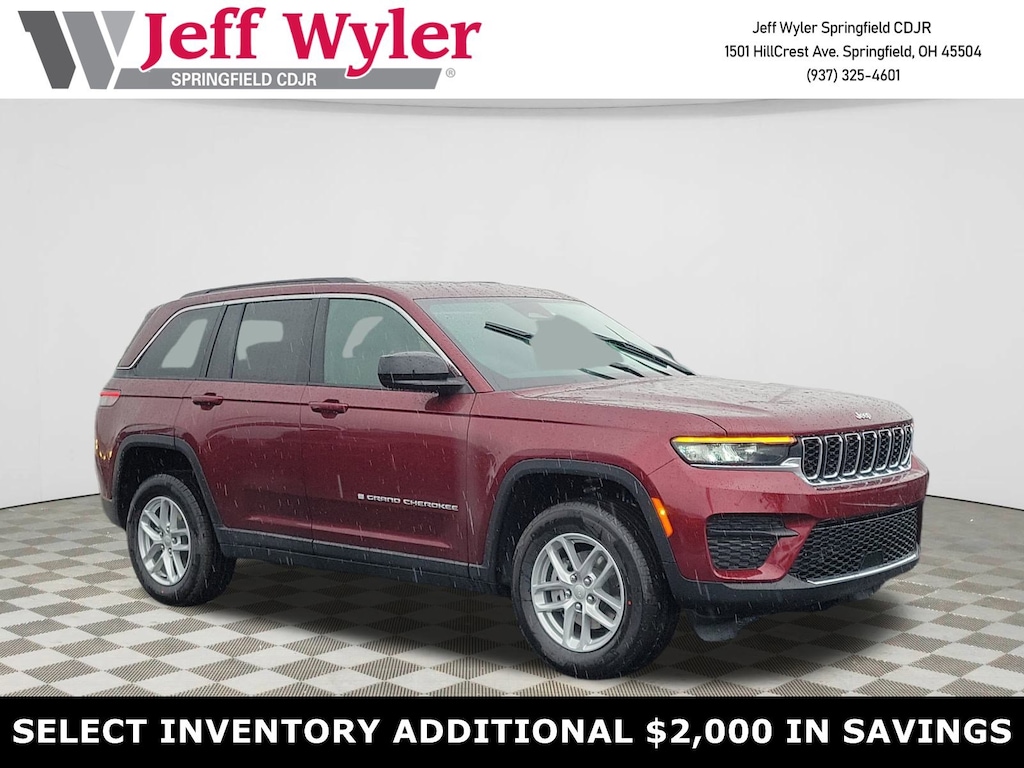 Priced below KBB Fair Purchase Price! Jeff Wyler Springfield Auto Mall is very proud to offer this good-looking 2025 Jeep Grand Cherokee Laredo X in Velvet Red Pearlcoat. Well equipped with: Luxury Tech Group I (115V Auxiliary Power Outlet, Heated Front Seats, Heated Steering Wheel, Power Liftgate, Rain Sensitive Windshield Wipers, Remote Start System, Satellite Radio, Secondary Active Grille Shutters, Selectable Tire Fill Alert, and Wireless Charging Pad), Quick Order Package 23D Laredo X (Laredo X, Power Sunroof, and Wheels: 18" x 8" Fully Painted Aluminum), 4-Wheel Disc Brakes, 6 Speakers, ABS brakes, Air Conditioning, Alloy wheels, AM/FM radio: SiriusXM, Anti-whiplash front head restraints, Automatic temperature control, Brake assist, Bumpers: body-color, Cloth Seats, Compass, Delay-off headlights, Driver door bin, Driver vanity mirror, Dual front impact airbags, Dual front side impact airbags, Electronic Stability Control, Emergency communication system, Four wheel independent suspension, Front anti-roll bar, Front Bucket Seats, Front Center Armrest w/Storage, Front dual zone A/C, Front License Plate Bracket, Front reading lights, Fully automatic headlights, Heated door mirrors, Illuminated entry, Knee airbag, Low tire pressure warning, Model Year Tracking, Normal Duty Suspension, Occupant sensing airbag, Outside temperature display, Overhead airbag, Overhead console, Panic alarm, ParkView Rear Back-Up Camera, Passenger door bin, Passenger vanity mirror, Power door mirrors, Power driver seat, Power steering, Power windows, Radio data system, Radio: Uconnect 5 with 8.4" Display, Rear anti-roll bar, Rear reading lights, Rear window defroster, Rear window wiper, Remote keyless entry, Security system, Speed control, Speed-Sensitive Wipers, Split folding rear seat, Spoiler, Steering wheel mounted audio controls, Tachometer, Telescoping steering wheel, Tilt steering wheel, Traction control, Trip computer, Variably intermittent wipers, Voltmeter, and Wheels: 17" x 6.5" Fully Painted Aluminum. 19/26 City/Highway MPG 19/26 City/Highway MPGWyler Family First Package Includes: NanoCure Appearance Protection: Exterior & Interior Chemical Sealant Applied to Protect Against Environmental Hazards (7 Year Warranty Coverage). Pulse- Rear end Collision Avoidance System Theft Deterrent Strategy gives you 5 Years of Coverage against vehicle Theft, Offering up to a $5,000 benefit. Available Incentives: $1500 - 2025 National Stellantis Loyalty Retail Bonus Cash . Exp. 02/02/2026 $2000 - 2025 National Select Inventory Bonus Cash w/ 3FV . Exp. 02/02/2026 $2250 - 2025 National Retail Bonus Cash . Exp. 02/02/2026 $500 - 2025 National 2025 First Responder Bonus Cash. Exp. 01/04/2027 $500 - 2025 National 2025 Military Bonus Cash. Exp. 01/04/2027 $750 - 2025 Midwest BC Retail Bonus Cash. Exp. 01/20/2026