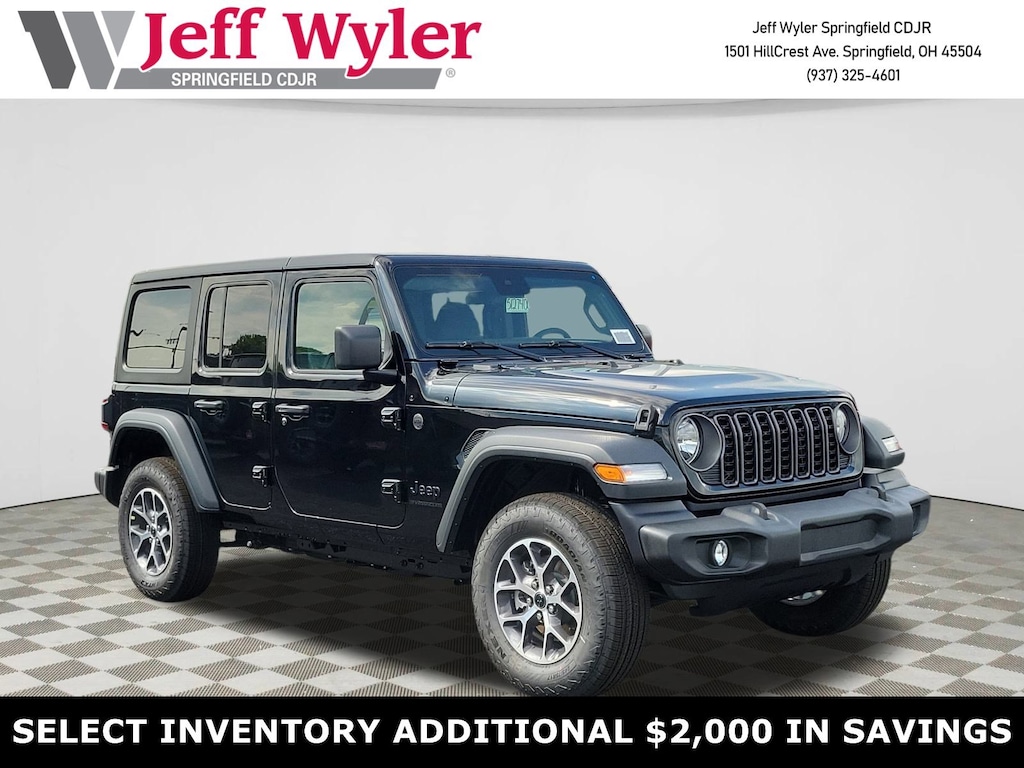 Jeff Wyler Springfield Auto Mall is pleased to offer this beautiful-looking 2025 Jeep Wrangler Sport S in Black Clearcoat. Well equipped with: Convenience Group (2-Door Passive Entry, Front Door Locks, Air Conditioning w/Auto Temperature Control, Air Filtering, Cluster 7.0" TFT Color Display, Emergency/Assistance Call, Heated Front Seats, Heated Steering Wheel, Remote Start System, and Universal Garage Door Opener), Quick Order Package 24S Sport S (Advanced Brake Assist, Automatic Headlamps, Corning Gorilla Glass, Deep Tint Sunscreen Windows, Enhanced Adaptive Cruise Control, Full Speed Forward Collision Warning Plus, Power Heated Mirrors, Premium Wrapped Steering Wheel, Security Alarm, Sun Visors w/Illuminated Vanity Mirrors, and Wheels: 17" x 7.5" Gray), Safety Group (Auto High Beam Headlamp Control, Blind Spot & Cross Path Detection, Injection Molded Black Rear Bumper, LED Taillamps, and ParkSense Rear Park Assist System), 110 MPH Vehicle Max Speed Calibration, 3.45 Overall Top Gear Ratio, 4-Wheel Disc Brakes, 8 Speakers, ABS brakes, Air Conditioning, AM/FM radio: SiriusXM, Apple CarPlay/Android Auto, Aux Battery, Black 3-Piece Hard Top, Brake assist, Cloth Low-Back Bucket Seats, Compass, Delay-off headlights, Driver door bin, Driver vanity mirror, Dual front impact airbags, Dual front side impact airbags, Electronic Stability Control, Freedom Panel Storage Bag, Front anti-roll bar, Front Bucket Seats, Front Center Armrest w/Storage, Front fog lights, Front reading lights, Illuminated entry, Integrated roll-over protection, Low tire pressure warning, MOPAR All-Weather Floor Mats, Non-Lock Fuel Cap w/o Discriminator, Normal Duty Suspension, Occupant sensing airbag, Outside temperature display, Overhead airbag, Panic alarm, ParkView Rear Back-Up Camera, Passenger door bin, Passenger vanity mirror, Power steering, Power windows, Radio data system, Radio: Uconnect 5 w/12.3" Display, Rear anti-roll bar, Rear reading lights, Rear Window Defroster, Rear Window Wiper/Washer, Remote keyless entry, Speed control, Split folding rear seat, Steering wheel mounted audio controls, Stop-Start Dual Battery System, Tachometer, Telescoping steering wheel, Tilt steering wheel, Traction control, Trip computer, Variably intermittent wipers, Wheels: 17" x 7.5" Black Steel Styled, and Wheels: 17" x 7.5" Machined w/Black Pockets. 18/23 City/Highway MPGWyler Family First Package Includes: NanoCure Appearance Protection: Exterior & Interior Chemical Sealant Applied to Protect Against Environmental Hazards (7 Year Warranty Coverage). Pulse- Rear end Collision Avoidance System Theft Deterrent Strategy gives you 5 Years of Coverage against vehicle Theft, Offering up to a $5,000 benefit. Available Incentives: $1500 - 2025 National Bonus Cash . Exp. 02/02/2026 $1500 - 2025 National Stellantis Loyalty Retail Bonus Cash . Exp. 02/02/2026 $2000 - 2025 National Select Inventory Bonus Cash w/ 3FV . Exp. 02/02/2026 $2500 - 2025 National Retail Bonus Cash . Exp. 02/02/2026 $500 - 2025 National 2025 First Responder Bonus Cash. Exp. 01/04/2027 $500 - 2025 National 2025 Military Bonus Cash. Exp. 01/04/2027