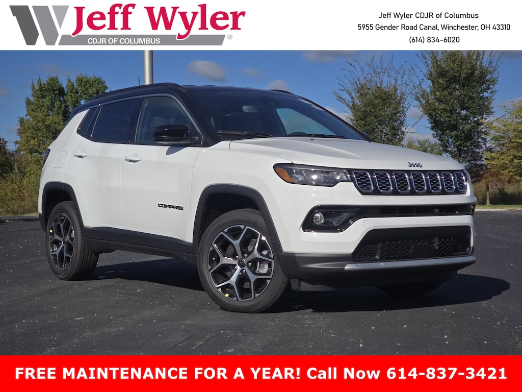Jeff Wyler Columbus Auto Mall is pleased to offer this attractive 2026 Jeep Compass Limited in Bright White Clearcoat. Well equipped with: 4WD, 3.73 Final Drive Ratio, 4-Wheel Disc Brakes, 6 Speakers, ABS brakes, Active Cruise Control, Air Conditioning, Alloy wheels, AM/FM radio: SiriusXM with 360L, Anti-whiplash front head restraints, Apple CarPlay/Android Auto, Auto High-beam Headlights, Auto-dimming Rear-View mirror, Automatic temperature control, Brake assist, Bumpers: body-colour, Compass, Delay-off headlights, Driver door bin, Driver vanity mirror, Dual front impact airbags, Dual front side impact airbags, Electronic Stability Control, Emergency communication system: SiriusXM Guardian, Four wheel independent suspension, Front anti-roll bar, Front Bucket Seats, Front dual zone A/C, Front fog lights, Front reading lights, Fully automatic headlights, Heated door mirrors, Heated front seats, Heated steering wheel, Illuminated entry, Knee airbag, Leather Shift Knob, Leather steering wheel, Leatherette Seats, Low tire pressure warning, Occupant sensing airbag, Outside temperature display, Overhead airbag, Overhead console, Panic alarm, ParkView Rear Back-Up Camera, Passenger door bin, Passenger vanity mirror, Power door mirrors, Power driver seat, Power Liftgate, Power steering, Power windows, Premium audio system: UConnect 5, Radio: Uconnect 5 w/10.1" Display, Rain sensing wipers, Rear anti-roll bar, Rear window defroster, Rear window wiper, Remote keyless entry, Security system, Speed control, Split folding rear seat, Spoiler, Steering wheel mounted audio controls, Tachometer, Telescoping steering wheel, Tilt steering wheel, Traction control, Turn signal indicator mirrors, Variably intermittent wipers, and Wheels: 18" x 7" Painted Diamond Cut Aluminum. 23/31 City/Highway MPGWyler Family First Package Includes: NanoCure Appearance Protection: Exterior & Interior Chemical Sealant Applied to Protect Against Environmental Hazards (7 Year Warranty Coverage). Pulse- Rear End Collision Avoidance System Theft Deterrent Strategy gives you 5 Years of Coverage against vehicle theft, Offering up to a $5,000 benefit. Price does not include Tax, Title, License and Documentary Fee$500 - 2026 National Retail Bonus Cash . Exp. 11/03/2025