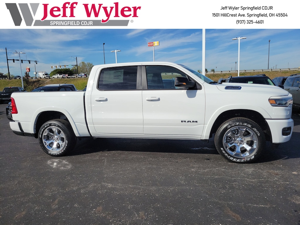 Jeff Wyler Springfield Auto Mall is pumped up to offer this attractive 2026 Ram 1500 Big Horn/Lone Star in Bright White Clearcoat. Well equipped with: Big Horn Level 2 Equipment Group (115V Auxiliary Power Outlet, 115V Auxiliary Rear Power Outlet, 12" Touchscreen Display, 2nd Row In Floor Storage Bins, 3 Rear Seat Head Restraints, 4 Way Front Headrests, 400W Inverter, 4G LTE Wi-Fi Hot Spot, 9 Amplified Speakers w/Subwoofer, Air Conditioning ATC w/Dual Zone Control, Apple CarPlay, Auto Power-Folding Mirrors, Auto-Dimming Exterior Driver Mirror, Auto-Dimming Rear-View Mirror, Black Exterior Mirrors, Black Premium Power Mirrors, Body Color Fender Flares, Bucket Seats, Center Console Parts Module, Cluster 7.0" TFT Color Display, Configurable Drive Mode, Connected Travel & Traffic Services, Connectivity - US/Canada, Convex Wide-Angle Exterior Mirror Insert, Deluxe Cloth Bucket Seats, Disassociated Touchscreen Display, Exterior Mirrors Courtesy Lamps, Exterior Mirrors w/Heating Element, Exterior Mirrors w/Supplemental Signals, Front Seat Back Map Pockets, Full Length Floor Console, Global Telematics Box Module (TBM), Glove Box Lamp, Google Android Auto, GPS Antenna Input, GPS Navigation, HD Radio, Heated Front Seats, Heated Steering Wheel, Integrated Center Stack Radio, Integrated Voice Command w/Bluetooth, Leather Wrapped Steering Wheel, LED Dome Lamp w/On/Off Switch, LED Footwell Lighting, Manual Adjust 4-Way Front Passenger Seat, Media Hub w/2 Charge Only USBs, Overhead LED Lamps, Power 2-Way Driver Lumbar Adjust, Power Adjust 8-Way Driver Seat, Power Adjustable Pedals, Premium Overhead Console, Radio: Uconnect 5 Nav w/12.0" Display, Rear 60/40 Folding Seat, Rear Center Armrest, Rear Power Sliding Window, Rear Window Defroster, Remote Tailgate Release, Secondary Active Grille Shutters, Security Alarm, SiriusXM Radio Service, SiriusXM w/360L, Steering Wheel Mounted Audio Controls, Sun Visors w/Illuminated Vanity Mirrors, Universal Garage Door Opener, USB Host Flip, Wheels: 20" x 9" Aluminum Chrome Clad (WRK), and Wireless Charging Pad), Quick Order Package 21Z Big Horn, Sport Appearance Package (Black Interior Accents, Body Color Door Handles, Body Color Front Bumper, Body Color Rear Bumper w/Step Pads, Body Color Tailgate Handle, Grille Surround 1 Body Color Texture 1 Black, and RAM Grille Badge - Chrome), 4-Wheel Disc Brakes, 48V Belt Starter Generator, 6 Speakers, ABS brakes, Air Conditioning, Alloy wheels, AM/FM radio, Apple CarPlay/Android Auto, Auto High-beam Headlights, Brake assist, Bumpers: chrome, Cloth Bucket Seats, Compass, Delay-off headlights, Driver door bin, Dual front impact airbags, Dual front side impact airbags, Electronic Stability Control, Front anti-roll bar, Front Bucket Seats, Front Center Armrest w/Storage, Front fog lights, Front License Plate Bracket, Front reading lights, Front wheel independent suspension, Fully automatic headlights, Heated door mirrors, Illuminated entry, Low tire pressure warning, Manual Adjust 4-Way Driver Seat, Manual Folding Exterior Mirrors, Occupant sensing airbag, Outside temperature display, Overhead airbag, Overhead console, Panic alarm, ParkView Rear Back-Up Camera, Passenger door bin, Passenger vanity mirror, Power door mirrors, Power steering, Power windows, Radio data system, Radio: Uconnect 5 W w/8.4" Display, Rear anti-roll bar, Rear step bumper, Rear Wheelhouse Liners, Remote keyless entry, Speed control, Supplier Part Tracking (J-1), Tachometer, Telescoping steering wheel, Tilt steering wheel, Traction control, Trailer Brake Control, Trip computer, Variably intermittent wipers, Voltmeter, and Wheels: 18" x 8" Cast-Aluminum Painted. 17/24 City/Highway MPGWyler Family First Package Includes: NanoCure Appearance Protection: Exterior & Interior Chemical Sealant Applied to Protect Against Environmental Hazards (7 Year Warr Available Incentives: $3500 - 2026 National Retail Consumer Cash . Exp. 11/03/2025 $500 - 2026 National 2026 Military Bonus Cash . Exp. 01/05/2026