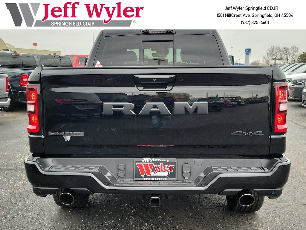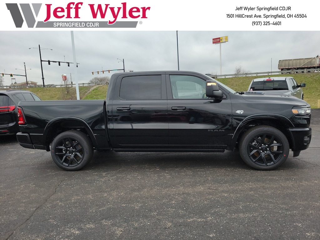 Jeff Wyler Springfield Auto Mall is honored to offer this good-looking 2026 Ram 1500 Laramie in Diamond Black Crystal Pearlcoat. Well equipped with: Advanced Safety Group II (12-Way/1-Way Trailer Connector, Active Driving Assist System, Drowsy Driver Detection, Evasive Steer Assist, Exterior Mirrors Approach Lamps, Intersection Collision Assist System, Surround View Camera System, and Traffic Sign Recognition), Laramie Level 2 Equipment Group (14.4" Touchscreen Display, 4G LTE Wi-Fi Hot Spot, Cluster 12" TFT Color Display, Connected Travel and Traffic Services, Connectivity - US/Canada, Front Passenger Interactive Display, GPS Navigation, Harman/Kardon 19 Speaker Premium Sound, Integrated Center Stack Radio, Integrated Voice Command with Bluetooth, Power Tailgate, Radio: Uconnect 5 Nav with 14.4" Display, Rain Sensitive Windshield Wipers, SiriusXM Radio Service, SiriusXM with 360L, and USB Host Flip), Night Edition (Accent Color Door Handles, Accent Color Premium Power Mirrors, Accent Color Tailgate Handle, Anti-Spin Differential Rear Axle, Auto Power-Folding Mirrors, Auto-Dimming Exterior Driver Mirror, Black Exterior Truck Badging, Black Headlamp Bezels, Black Interior Accents, Black Painted Exterior Mirrors Caps, Black Tail Lamp Bezels, Body Color Front Bumper, Body Color Rear Bumper with Step Pads, Convex Wide-Angle Exterior Mirror Insert, Dual Exhaust with Black Tips, Exterior Mirrors Courtesy Lamps, Exterior Mirrors with Heating Element, Exterior Mirrors with Memory, Exterior Mirrors with Supplemental Signals, Grille Surround 3 Black Texture 2 Black, Pirelli Brand Tires, Proximity Approach/Departure Lamps, RAM Grille Badge - Black, Sport Performance Hood, and Wheels: 22" x 9" Forged Aluminum), Quick Order Package 27H Laramie, Technology Group (Heads-Up Display and LED CHMSL Lamp), Towing Technology Group (Trailer Hitch Line-Up Assist), Trailer Tow Group (Trailer Brake Control, Trailer Reverse Steering Control, and Trailer Tire Pressure Monitoring System), 10 Speakers, 240 Amp Alternator, 4-Wheel Disc Brakes, ABS brakes, Active Noise Control System, Adjustable pedals, Air Conditioning, Alloy wheels, AM/FM radio: SiriusXM with 360L, Apple CarPlay/Android Auto, Audio memory, Auto High-beam Headlights, Auto-dimming door mirrors, Auto-Dimming Exterior Passenger Mirror, Auto-dimming Rear-View mirror, Automatic temperature control, Black Exterior Mirrors, Black Power-Fold Trailer Tow Mirrors, Brake assist, Bumpers: chrome, Chrome Exterior Mirrors, Compass, Delay-off headlights, Dome Dual LED Reading Lamp, Driver door bin, Driver vanity mirror, Dual front impact airbags, Dual front side impact airbags, Dual-Pane Panoramic Sunroof, E-Locker Rear Axle, Electronic Stability Control, Engine Block Heater, Forward and Reverse Utility Lights, Front anti-roll bar, Front Bucket Seats, Front Center Armrest w/Storage, Front dual zone A/C, Front fog lights, Front License Plate Bracket, Front reading lights, Front wheel independent suspension, Fully automatic headlights, Garage door transmitter, Hands-Free Active Driving Assist System, Heated door mirrors, Heated front seats, Heated rear seats, Heated steering wheel, Illuminated entry, Leather steering wheel, Leather Trimmed Bucket Seats, LED Dome/Reading Lamp, Low tire pressure warning, Memory seat, Mirror Clearance/Running Lights, Navigation System, Occupant sensing airbag, Off-Road Information Pages, Outside temperature display, Overhead airbag, Overhead console, Panic alarm, ParkView Rear Back-Up Camera, Passenger door bin, Passenger vanity mirror, Pedal memory, Power Deployable Running Boards, Power door mirrors, Power driver seat, Power passenger seat, Power steering, Power Telescoping Mirrors, Power windows, Power-Adjustable Convex Aux Mirrors, Radio data system, Radio: Uconnect 5 Navigation with 12.0" Display, RAM Grille Badge - Chrome, Rear anti-roll Available Incentives: $1000 - 2026 National Bonus Cash . Exp. 03/31/2026 $3500 - 2026 National Retail Bonus Cash . Exp. 03/31/2026