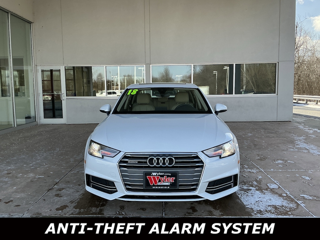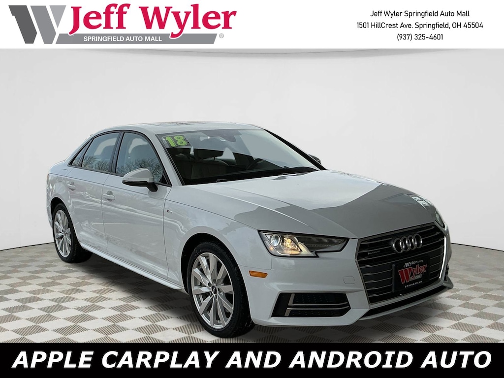 Jeff Wyler Springfield Auto Mall is excited to offer this charming 2018 Audi A4 2.0T Premium in Glacier White. Well equipped with: 18" Wheel Package (Wheels: 8" x 18" 10-Spoke-Star Design), Convenience Package (Anti-Theft Alarm System w/Immobilizer, Audi Advanced Key, Color Driver Information System w/Trip Computer, Driver Memory, Heated Auto-Dimming Power Ext Mirrors w/Memory, and SiriusXM Satellite Radio), 10 Speakers, 4-Wheel Disc Brakes, ABS brakes, Air Conditioning, Alloy wheels, AM/FM radio, Anti-whiplash front head restraints, Audi Guard All-Weather Floor Mats, Audi smartphone interface (Apple CarPlay/Android Auto), Auto-dimming Rear-View mirror, Automatic temperature control, Brake assist, Bumpers: body-color, Compass, Delay-off headlights, Driver door bin, Driver vanity mirror, Dual front impact airbags, Dual front side impact airbags, Electronic Stability Control, Exterior Parking Camera Rear, Four wheel independent suspension, Front anti-roll bar, Front Bucket Seats, Front Center Armrest, Front dual zone A/C, Front fog lights, Front reading lights, Garage door transmitter: HomeLink, Heated 3-Step Front Bucket Seats, Heated door mirrors, Heated front seats, High intensity discharge headlights: Xenon plus, Illuminated entry, Knee airbag, Leather Seating Surfaces, Leather Shift Knob, Leather steering wheel, Low tire pressure warning, Natural Gray Oak Inlays, Occupant sensing airbag, Outside temperature display, Overhead airbag, Overhead console, Panic alarm, Passenger door bin, Passenger vanity mirror, Power door mirrors, Power driver seat, Power moonroof, Power passenger seat, Power steering, Power windows, Radio data system, Radio: Audi MMI Navigation Plus w/MMI Touch, Radio: Audi Sound System, Rain sensing wipers, Rear air conditioning, Rear anti-roll bar, Rear fog lights, Rear reading lights, Rear seat center armrest, Rear window defroster, Remote CD player, Remote keyless entry, Speed control, Speed-sensing steering, Speed-Sensitive Wipers, Split folding rear seat, Steering wheel mounted audio controls, Tachometer, Telescoping steering wheel, Tilt steering wheel, Traction control, Trip computer, Turn signal indicator mirrors, USB Cables (DISC), Variably intermittent wipers, and Wheels: 7.5" x 17" 5-Spoke-Y Design. Awards: * 2018 KBB.com 10 Most Awarded Brands Ask about available certifications. Used vehicles 10 years of age or newer with less than 100,000 miles are eligible for the Wyler Assurance Program, but eligible vehicles must pass our reconditioning process and multi-point inspection. Provided the vehicle passes inspection, vehicles will be eligible for the 6 month/6,000 mile limited warranty. The 6 month/6,000 mile limited warranty is NOT available on AS-IS vehicles, wholesale vehicles, lease buyback/pass-thru vehicles or un-inspected vehicles. Note that this program can also apply to vehicles where the remaining factory coverage is less than 6 months or 6,000 miles. Please check the Federal Trade Commission (FTC) Buyers guide on the vehicle for full details as to whether or not warranty coverage may apply. Contact Dealer for additional details. The Wyler Assurance 6 month/6,000 Mile limited warranty ends 6 months from the date of the Retail Purchase Agreement (BUYERS ORDER) or when the vehicle's odometer registers 6,000 additional miles to the mileage listed on the BUYERS ORDER, whichever comes first. Your Deductible - The warranty holder on your contract pays the first $100 of each covered repair.