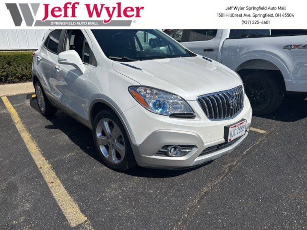 Jeff Wyler Springfield Auto Mall is pumped up to offer this great 2015 Buick Encore Leather in White Pearl Tricoat. Well equipped with: Preferred Equipment Group 1SL, 3.53 Final Drive Axle Ratio, 4-Wheel Disc Brakes, 6 Speakers, 6-Way Power Driver Seat Adjuster, 6-Way Power Front Passenger Seat Adjuster, ABS brakes, Air Conditioning, Alloy wheels, AM/FM radio: SiriusXM, Auto-dimming Rear-View mirror, Automatic temperature control, Brake assist, Bumpers: body-color, CD player, Compass, Delay-off headlights, Driver door bin, Driver vanity mirror, Driver's Seat Mounted Armrest, Dual front impact airbags, Dual front side impact airbags, Electronic Stability Control, Emergency communication system: OnStar Directions & Connections, Exterior Parking Camera Rear, Front anti-roll bar, Front Bucket Seats, Front dual zone A/C, Front fog lights, Front License Plate Bracket, Front reading lights, Front wheel independent suspension, Fully automatic headlights, Heated door mirrors, Heated Driver & Front Passenger Seats, Heated front seats, Heated steering wheel, Illuminated entry, Knee airbag, Leather steering wheel, Leather-Appointed Seat Trim, Low tire pressure warning, Memory seat, Occupant sensing airbag, Outside temperature display, Overhead airbag, Panic alarm, Passenger door bin, Passenger vanity mirror, Power door mirrors, Power driver seat, Power passenger seat, Power steering, Power windows, Premium audio system: IntelliLink, Radio data system, Radio: AM/FM Audio System w/MP3 CD Player, Rear seat center armrest, Rear side impact airbag, Rear window defroster, Rear window wiper, Remote keyless entry, Ride & Handling Suspension, Roof rack: rails only, Security system, SiriusXM Satellite Radio, Speed control, Speed-sensing steering, Split folding rear seat, Spoiler, Steering wheel mounted audio controls, Tachometer, Telescoping steering wheel, Tilt steering wheel, Traction control, Trip computer, Turn signal indicator mirrors, Variably intermittent wipers, and Wheels: 18" 5-Spoke Painted Cast Aluminum. Awards: * JD Power Automotive Performance, Execution and Layout (APEAL) Study * 2015 IIHS Top Safety Pick * 2015 KBB.com 5-Year Cost to Own Awards * 2015 KBB.com Brand Image Awards Reviews: * Small doesn’t have to mean skimpy. The 2015 Buick Encore SUV may be compact, but its bold appearance, long list of luxury and electronic trappings and modern drivetrain make it an exceptionally good value. Source: KBB.com * Quiet interior; good fuel economy; long list of tech and safety features. Source: EdmundsAsk about available certifications. Used vehicles 10 years of age or newer with less than 100,000 miles are eligible for the Wyler Assurance Program, but eligible vehicles must pass our reconditioning process and multi-point inspection. Provided the vehicle passes inspection, vehicles will be eligible for the 6 month/6,000 mile limited warranty. The 6 month/6,000 mile limited warranty is NOT available on AS-IS vehicles, wholesale vehicles, lease buyback/pass-thru vehicles or un-inspected vehicles. Note that this program can also apply to vehicles where the remaining factory coverage is less than 6 months or 6,000 miles. Please check the Federal Trade Commission (FTC) Buyers guide on the vehicle for full details as to whether or not warranty coverage may apply. Contact Dealer for additional details. The Wyler Assurance 6 month/6,000 Mile limited warranty ends 6 months from the date of the Retail Purchase Agreement (BUYERS ORDER) or when the vehicle's odometer registers 6,000 additional miles to the mileage listed on the BUYERS ORDER, whichever comes first. Your Deductible - The warranty holder on your contract pays the first $100 of each covered repair.