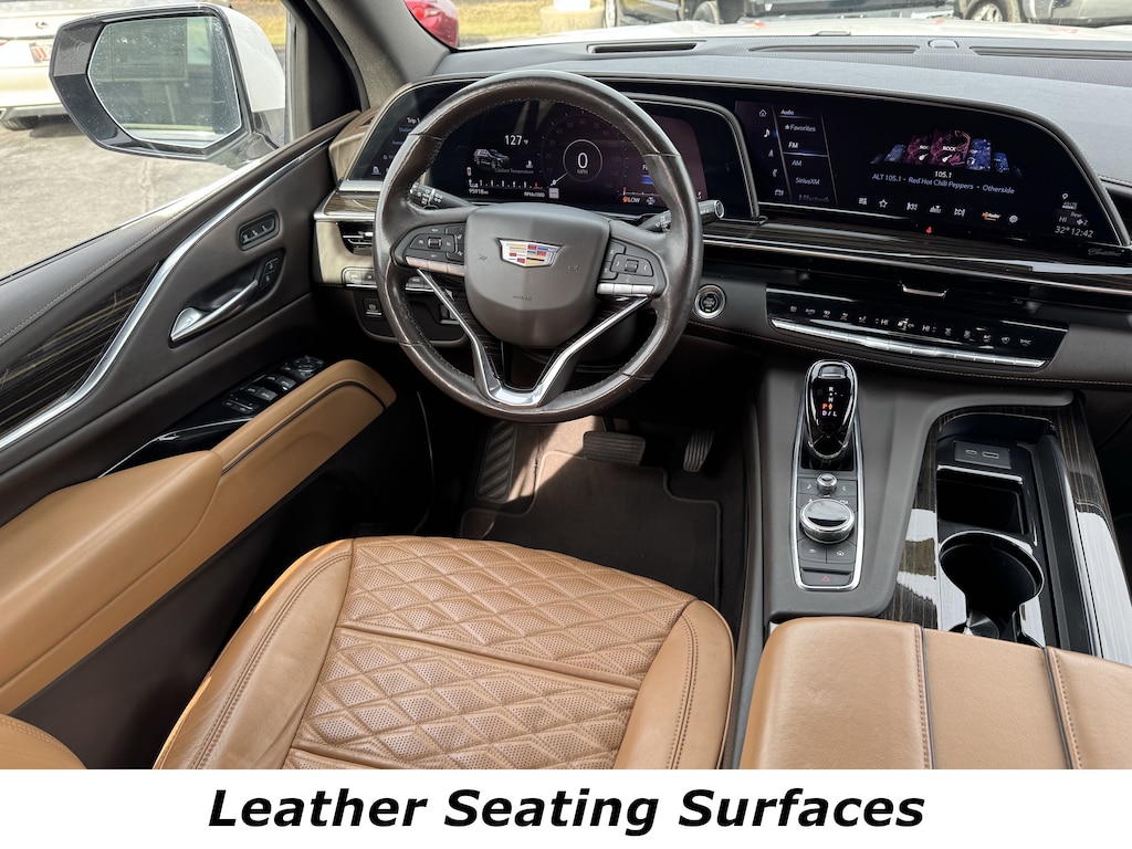 Recent Arrival! 4WD, Brandy With Very Dark Atmosphere Accents Leather.Awards: * ALG Residual Value Preferred Equipment Group 1SB (Air Ionizer, AKG Studio 19-Speaker Audio System, Automatic Emergency Braking, Door Lock & Latch Shields, Electronic Cruise Control w/Set & Resume Speed, Enhanced Automatic Parking Assist, Glass Breakage Sensor, Lane Change Alert w/Side Blind Zone Alert, Lane Keep Assist w/Lane Departure Warning, Mechanical Limited-Slip Differential, Power Panoramic Tilt-Sliding Sunroof, Rear Camera Mirror, Rear Camera Mirror Washer, Rear Cross Traffic Alert, Reconfigurable Full-Color Head-Up Display, Running Board Assist Steps, Theft-Deterrent Alarm System, Vehicle Inclination Sensor, and Vehicle Interior Movement Sensor), 4WD, Brandy With Very Dark Atmosphere Accents Leather, 16.9 Diagonal OLED Infotainment Screen, 19 Speakers, 2-Presets Memory For Driver Seat Adjuster, 3.23 Axle Ratio, 3rd row seats: split-bench, 4-Way Power Driver Lumbar Seat Adjuster, 4-Way Power Front Passenger Lumbar Seat Adjuster, 4-Wheel Disc Brakes, 8-Way Power Driver Seat Adjuster, 8-Way Power Front Passenger Seat Adjuster, ABS brakes, Air Conditioning, Alloy wheels, AM/FM radio: SiriusXM with 360L, Apple CarPlay/Android Auto, Audio memory, Auto High-beam Headlights, Auto tilt-away steering wheel, Auto-dimming door mirrors, Auto-dimming Rear-View mirror, Automatic temperature control, Brake assist, Bumpers: body-color, Compass, Delay-off headlights, Driver door bin, Driver vanity mirror, Dual front impact airbags, Dual front side impact airbags, Electronic Stability Control, Emergency communication system: OnStar and Cadillac connected services capable, Four wheel independent suspension, Front anti-roll bar, Front Bucket Seats, Front Center Armrest w/Storage, Front dual zone A/C, Front reading lights, Fully automatic headlights, Garage door transmitter, HD Radio, Heads-Up Display, Heated & Ventilated Driver & Front Passenger Seats, Heated door mirrors, Heated Driver & Front Passenger Seats, Heated front seats, Heated rear seats, Heated steering wheel, Illuminated entry, Leather Seating Surfaces w/Mini-Chevron Perf Inserts, Leather steering wheel, Low tire pressure warning, Memory seat, Navigation System, Not Equipped w/Automatic Stop/Start, Not Equipped w/Steering Column Lock, Occupant sensing airbag, Outside temperature display, Overhead airbag, Overhead console, Panic alarm, Passenger door bin, Passenger vanity mirror, Power door mirrors, Power driver seat, Power Liftgate, Power moonroof, Power passenger seat, Power steering, Power windows, Premium Smooth Ride Suspension, Radio data system, Radio: AM/FM/SiriusXM w/Navigation, Rain sensing wipers, Rear air conditioning, Rear anti-roll bar, Rear reading lights, Rear window defroster, Rear window wiper, Remote keyless entry, Roof rack: rails only, Security system, SiriusXM w/360L, Speed control, Split folding rear seat, Spoiler, Steering wheel memory, Steering wheel mounted audio controls, Tachometer, Teen Driver, Telescoping steering wheel, Tilt steering wheel, Traction control, Trip computer, Turn signal indicator mirrors, Variably intermittent wipers, Ventilated front seats, Voltmeter, Wheels: 22 14-Spoke Alloy w/Polished Finish, and Wireless Apple CarPlay/Wireless Android Auto.
