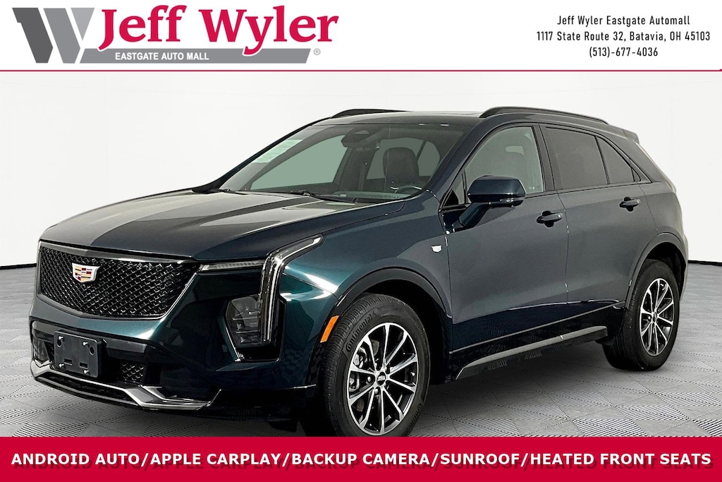Jeff Wyler Eastgate Auto Mall is pleased to offer this handsome 2024 Cadillac XT4 Sport in Emerald Lake Metallic. Well equipped with: 18" Split 5-Spoke Alloy Wheels, 3.47 Axle Ratio, 4-Way Driver Seat Power Lumbar Control, 4-Way Passenger Seat Power Lumbar Control, 4-Wheel Disc Brakes, 6-Way Power Passenger Seat Adjuster, 7 Speakers, 7-Speaker Audio System, 8-Way Power Driver Seat Adjuster, ABS brakes, Air Conditioning, Alloy wheels, AM/FM radio: SiriusXM with 360L, Apple CarPlay/Android Auto, Auto High-beam Headlights, Auto-dimming door mirrors, Auto-Dimming Inside Rear-View Mirror, Auto-dimming Rear-View mirror, Automatic Emergency Braking, Automatic temperature control, Brake assist, Bumpers: body-color, Compass, Delay-off headlights, Driver door bin, Driver vanity mirror, Dual front impact airbags, Dual front side impact airbags, Electronic Cruise Control w/Set & Resume Speed, Electronic Stability Control, Emergency communication system: OnStar and Cadillac connected services capable, Four wheel independent suspension, Front anti-roll bar, Front Bucket Seats, Front Center Armrest, Front dual zone A/C, Front reading lights, Fully automatic headlights, Garage door transmitter, HD Rear Vision Camera, Heated door mirrors, Illuminated entry, Inteluxe Seat Trim, Knee airbag, Leather steering wheel, Low tire pressure warning, Manual Rake & Telescopic Steering Column, Memory seat, Navigation system: Google Automotive Services Capable, Occupant sensing airbag, Outside temperature display, Overhead airbag, Overhead console, Panic alarm, Passenger door bin, Passenger vanity mirror, Power door mirrors, Power driver seat, Power Liftgate, Power passenger seat, Power steering, Power windows, Radio data system, Radio: Google Built-In Infotainment Experience, Rain sensing wipers, Rear anti-roll bar, Rear reading lights, Rear seat center armrest, Rear window defroster, Rear window wiper, Remote keyless entry, Roof rack: rails only, Security system, SiriusXM w/360L, Speed control, Speed-sensing steering, Split folding rear seat, Spoiler, Standard Suspension, Steering wheel mounted audio controls, Tachometer, Telescoping steering wheel, Tilt steering wheel, Traction control, Trip computer, Turn signal indicator mirrors, Variably intermittent wipers, Voltmeter, and Wireless Apple CarPlay/Wireless Android Auto. CARFAX One-Owner. Clean CARFAX. Ask about available certifications. Used vehicles 10 years of age or newer with less than 100,000 miles are eligible for the Wyler Assurance Program, but eligible vehicles must pass our reconditioning process and multi-point inspection. Provided the vehicle passes inspection, vehicles will be eligible for the 6 month/6,000 mile limited warranty. The 6 month/6,000 mile limited warranty is NOT available on AS-IS vehicles, wholesale vehicles, lease buyback/pass-thru vehicles or un-inspected vehicles. Note that this program can also apply to vehicles where the remaining factory coverage is less than 6 months or 6,000 miles. Please check the Federal Trade Commission (FTC) Buyers guide on the vehicle for full details as to whether or not warranty coverage may apply. Contact Dealer for additional details. The Wyler Assurance 6 month/6,000 Mile limited warranty ends 6 months from the date of the Retail Purchase Agreement (BUYERS ORDER) or when the vehicle's odometer registers 6,000 additional miles to the mileage listed on the BUYERS ORDER, whichever comes first. Your Deductible - The warranty holder on your contract pays the first $100 of each covered repair.