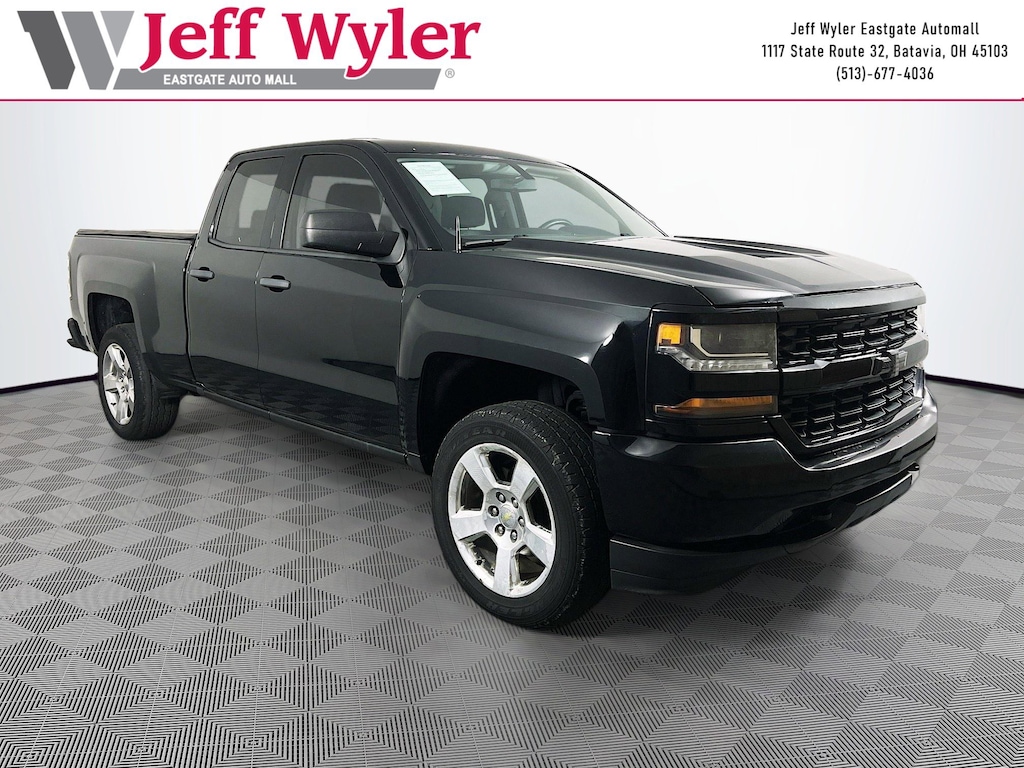 Jeff Wyler Eastgate Auto Mall is delighted to offer this fantastic-looking 2016 Chevrolet Silverado 1500 Custom in Black. Well equipped with: 150 Amp Alternator, 20" x 9" Chrome Clad Aluminum Wheels, 3-Passenger Full-Width Folding Rear Bench Seat, 3.42 Rear Axle Ratio, 4-Wheel Disc Brakes, 40/20/40 Front Split Bench Seat, 6 Speaker Audio System, 6 Speakers, ABS brakes, Air Conditioning, Alloy wheels, AM/FM radio, Apple CarPlay/Android Auto, Black Power Adjustable Heated Outside Mirrors, Bluetooth® For Phone, Body Color Rear Bumper w/Cornersteps, Body-Color Grille Surround, Body-Color Headlamp Bezels, Brake assist, Bumpers: body-color, Cloth Seat Trim, Deep-Tinted Glass, Delay-off headlights, Driver door bin, Driver Information Center, Dual front impact airbags, Dual front side impact airbags, Electronic Stability Control, Front anti-roll bar, Front Body-Color Bumper, Front Center Armrest w/Storage, Front Frame-Mounted Black Recovery Hooks, Front reading lights, Front wheel independent suspension, Fully automatic headlights, Graphite-Colored Rubberized-Vinyl Floor Covering, Heated door mirrors, Heavy Duty Suspension, High-Intensity Discharge Headlights, Illuminated entry, Low tire pressure warning, Manual Tilt Wheel Steering Column, Occupant sensing airbag, Overhead airbag, Overhead console, Passenger door bin, Passenger vanity mirror, Power door mirrors, Power steering, Power windows, Power Windows w/Driver Express Up, Premium audio system: Chevrolet MyLink, Radio data system, Radio: AM/FM w/7" Diagonal Color Touch Screen, Rear reading lights, Rear step bumper, Silverado Custom Trim, Speed control, Speed-sensing steering, Tachometer, Tilt steering wheel, Traction control, Trip computer, Variably intermittent wipers, and Voltmeter. Reviews: * Quick acceleration and strong towing and hauling ability, thanks to available V8 engines; front seats are comfortable for long drives; cabin is pleasingly quiet at highway speeds. Source: Edmunds * Powerful, fuel-efficient engines; many available configurations; well-built, comfortable interior; quiet highway ride. Source: EdmundsAwards: * JD Power Initial Quality Study Ask about available certifications. Used vehicles 10 years of age or newer with less than 100,000 miles are eligible for the Wyler Assurance Program, but eligible vehicles must pass our reconditioning process and multi-point inspection. Provided the vehicle passes inspection, vehicles will be eligible for the 6 month/6,000 mile limited warranty. The 6 month/6,000 mile limited warranty is NOT available on AS-IS vehicles, wholesale vehicles, lease buyback/pass-thru vehicles or un-inspected vehicles. Note that this program can also apply to vehicles where the remaining factory coverage is less than 6 months or 6,000 miles. Please check the Federal Trade Commission (FTC) Buyers guide on the vehicle for full details as to whether or not warranty coverage may apply. Contact Dealer for additional details. The Wyler Assurance 6 month/6,000 Mile limited warranty ends 6 months from the date of the Retail Purchase Agreement (BUYERS ORDER) or when the vehicle's odometer registers 6,000 additional miles to the mileage listed on the BUYERS ORDER, whichever comes first. Your Deductible - The warranty holder on your contract pays the first $100 of each covered repair.