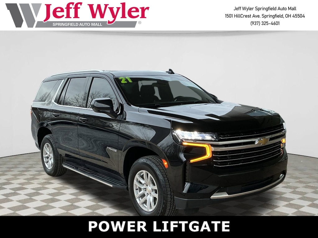 Jeff Wyler Springfield Auto Mall is proud to offer this fantastic 2021 Chevrolet Tahoe LT in Black. Well equipped with: License Plate Front Mounting Package, Preferred Equipment Group 1LT (1st & 2nd Row Color-Keyed Carpeted Floor Mats, 2 USB Data Ports, Auto-Dimming Inside Rear-View Mirror, Bright Front & Rear Door Sill Plates, Color-Keyed Carpeting Floor Covering, Driver & Front Outboard Passenger Airbags, Floor Console w/Storage Area, Hands-Free Rear Power Programmable Liftgate, HD Radio, Infotainment Display, Leather-Wrapped Steering Wheel, LED Daytime Running Lamps, Memory Settings for Driver, Remote Start, SiriusXM Radio w/360L, and Universal Home Remote), 10-Way Power Driver & Passenger Seat Adjusters, 3.23 Rear Axle Ratio, 3rd row seats: split-bench, 4-Wheel Disc Brakes, 9 Speakers, ABS brakes, Air Conditioning, Alloy wheels, AM/FM radio: SiriusXM with 360L, Apple CarPlay/Android Auto, Auto High-beam Headlights, Auto-dimming Rear-View mirror, Automatic temperature control, Bose 9-Speaker Stereo Audio System Feature, Brake assist, Bumpers: body-color, Compass, Delay-off headlights, Driver door bin, Driver vanity mirror, Dual front impact airbags, Dual front side impact airbags, Electronic Stability Control, Emergency communication system: OnStar and Chevrolet connected services capable, Four wheel independent suspension, Front anti-roll bar, Front Bucket Seats, Front Center Armrest, Front dual zone A/C, Front High-Back Reclining Bucket Seats, Front reading lights, Fully automatic headlights, Garage door transmitter, Heated door mirrors, Heated Driver & Front Passenger Seats, Heated front seats, Illuminated entry, Leather Seat Trim, Leather steering wheel, Low tire pressure warning, Memory seat, Occupant sensing airbag, Outside temperature display, Overhead airbag, Overhead console, Panic alarm, Passenger door bin, Passenger vanity mirror, Power door mirrors, Power driver seat, Power Liftgate, Power passenger seat, Power steering, Power windows, Premium audio system: Chevrolet Infotainment 3, Premium Smooth Ride Suspension, Radio: Chevrolet Infotainment 3 Plus System, Rain sensing wipers, Rear air conditioning, Rear anti-roll bar, Rear reading lights, Rear seat center armrest, Rear window defroster, Rear window wiper, Remote keyless entry, Roof rack: rails only, Security system, Speed control, Speed-sensing steering, Split folding rear seat, Spoiler, Steering wheel mounted audio controls, Tachometer, Telescoping steering wheel, Tilt steering wheel, Traction control, Trip computer, Variably intermittent wipers, Voltmeter, and Wheels: 18" x 8.5" Bright Silver Painted Aluminum. Awards: * JD Power Automotive Performance, Execution and Layout (APEAL) Study * ALG Residual Value Ask about available certifications. Used vehicles 10 years of age or newer with less than 100,000 miles are eligible for the Wyler Assurance Program, but eligible vehicles must pass our reconditioning process and multi-point inspection. Provided the vehicle passes inspection, vehicles will be eligible for the 6 month/6,000 mile limited warranty. The 6 month/6,000 mile limited warranty is NOT available on AS-IS vehicles, wholesale vehicles, lease buyback/pass-thru vehicles or un-inspected vehicles. Note that this program can also apply to vehicles where the remaining factory coverage is less than 6 months or 6,000 miles. Please check the Federal Trade Commission (FTC) Buyers guide on the vehicle for full details as to whether or not warranty coverage may apply. Contact Dealer for additional details. The Wyler Assurance 6 month/6,000 Mile limited warranty ends 6 months from the date of the Retail Purchase Agreement (BUYERS ORDER) or when the vehicle's odometer registers 6,000 additional miles to the mileage listed on the BUYERS ORDER, whichever comes first. Your Deductible - The warranty holder on your contract pays the first $100 of each covered repair.