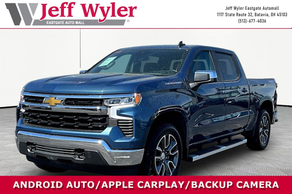 Jeff Wyler Eastgate Auto Mall is pumped up to offer this charming 2024 Chevrolet Silverado 1500 LT in Lakeshore Blue Metallic. Well equipped with: Convenience Package (10-Way Power Driver Seat w/Lumbar, 120-Volt Bed Mounted Power Outlet, 120-Volt Interior Power Outlet, Dual Rear USB Ports (Charge Only), Dual-Zone Automatic Climate Control, Heated Driver & Front Outboard Passenger Seats, Heated Steering Wheel, Keyless Open & Start, and Wrapped Steering Wheel), High Capacity Suspension Package, Standard Suspension Package, Trailering Package (Hitch Guidance), 12.3" Multicolor Reconfigurable Digital Display, 3.42 Rear Axle Ratio, 4-Wheel Disc Brakes, 40/20/40 Front Split-Bench Seat, 6 Speakers, 6-Speaker Audio System, ABS brakes, Air Conditioning, All-Star Edition, Alloy wheels, AM/FM radio: SiriusXM with 360L, Auto High-beam Headlights, Auto-Locking Rear Differential, Automatic Emergency Braking, Automatic temperature control, Bluetooth® For Phone, Brake assist, Bumpers: chrome, Chevrolet Connected Access Capable, Chrome Mirror Caps, Cloth Seat Trim, Color-Keyed Carpeting Floor Covering, Compass, Deep-Tinted Glass, Delay-off headlights, Driver door bin, Driver vanity mirror, Dual front impact airbags, Dual front side impact airbags, Electric Rear-Window Defogger, Electrical Steering Column Lock, Electronic Cruise Control, Electronic Stability Control, Following Distance Indicator, Forward Collision Alert, Front anti-roll bar, Front Center Armrest w/Storage, Front dual zone A/C, Front Frame-Mounted Black Recovery Hooks, Front Pedestrian Braking, Front reading lights, Front wheel independent suspension, Fully automatic headlights, HD Rear Vision Camera, Heated door mirrors, Heated front seats, Heated steering wheel, Illuminated entry, IntelliBeam Automatic High Beam On/Off, Lane Keep Assist w/Lane Departure Warning, LED Cargo Area Lighting, Low tire pressure warning, Occupant sensing airbag, OnStar & Chevrolet Connected Services Capable, Outside temperature display, Overhead airbag, Overhead console, Panic alarm, Passenger door bin, Passenger vanity mirror, Power door mirrors, Power driver seat, Power Front Windows w/Driver Express Up/Down, Power Front Windows w/Passenger Express Down, Power Rear Windows w/Express Down, Power steering, Power windows, Premium audio system: Chevrolet Infotainment 3 Premium, Radio data system, Radio: Chevrolet Infotainment 3 Premium System, Rear 60/40 Folding Bench Seat (Folds Up), Rear reading lights, Rear step bumper, Rear window defroster, Remote keyless entry, Remote Vehicle Starter System, Security system, SiriusXM w/360L, Speed control, Speed-sensing steering, Split folding rear seat, Steering Wheel Audio Controls, Steering wheel mounted audio controls, Tachometer, Telescoping steering wheel, Theft Deterrent System (Unauthorized Entry), Tilt steering wheel, Traction control, Trip computer, Variably intermittent wipers, Voltmeter, Wheels: 18" x 8.5" Bright Silver Painted Aluminum, Wheels: 20" x 9" Painted Aluminum, and Wi-Fi Hot Spot Capable. Certified. GM Details: * Powertrain Limited Warranty: 72 Month/100,000 Mile (whichever comes first) from original in-service date * 24 months/24,000 miles (whichever comes first) Certified Pre-Owned Scheduled Maintenance Plan and 3 days/150 miles (whichever comes first) Vehicle Exchange Program. SiriusXM 3-month trial subscription. * Transferable Warranty * 172 Point Inspection * Vehicle History * Warranty Deductible: $0 * Limited Warranty: 12 Month/12,000 Mile (whichever comes first) from certified purchase date * Roadside AssistanceAsk about available certifications. Used vehicles 10 years of age or newer with less than 100,000 miles are eligible for the Wyler Assurance Program, but eligible vehicles must pass our reconditioning process and multi-point inspection. Provided the vehicle passes inspection, vehicles will be eligible for the 6 month/6,000 mile limited warranty. The 6 month/6,000 mile limited warranty is NOT available on AS