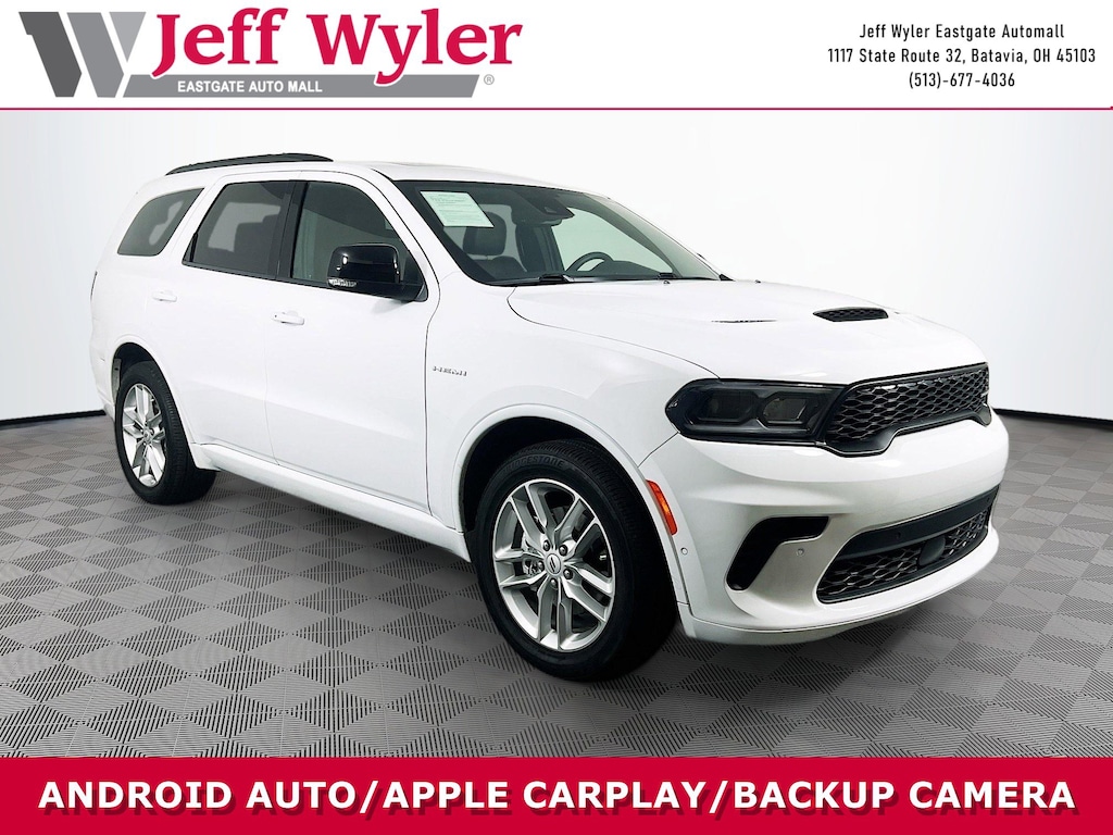 Jeff Wyler Eastgate Auto Mall is honored to offer this good-looking 2025 Dodge Durango R/T Plus in White Knuckle Clearcoat. Well equipped with: Quick Order Package 22T R/T Plus (115V Auxiliary Power Outlet, 7 & 4 Pin Wiring Harness, Adaptive Cruise Control w/Stop, Auto High Beam Headlamp Control, Auto-Dimming Exterior Driver Mirror, Black Roof Rails, Blind Spot w/Trailer Detection, Class IV Receiver Hitch, Dual Remote USB Port - Charge Only, Exterior Mirrors w/Heating Element, Exterior Mirrors w/Memory, Exterior Mirrors w/Supplemental Signals, Floor Console w/Leather Armrest, Full Speed Forward Collision Warning Plus, Gloss Black Exterior Mirrors, Heated Second Row Seats, Integrated Roof Rail Crossbars, Leather Trimmed Bucket Seats, Leather Wrapped Door Panels, LED Auxiliary Low Beam & Turn Signal, Power 6x9 Multi-Function Foldaway Mirrors, Power 8-Way Driver Memory 8-Way Passenger Seats, Power Driver/Passenger 4-Way Lumbar Adjust, Power Sunroof, Power Tilt & Telescopic Steering Column, Radio/Driver Seat/Mirrors Memory, Red Accent Stitching, Trailer Brake Control, and Ventilated Front Seats), 2nd Row Fold/Tumble Captain Chairs, 2nd Row Mini Console w/Cupholders, 2nd Row Seat Mounted Inboard Armrests, 3.09 Rear Axle Ratio, 3rd Row Floor Mat & Mini Console, 3rd row seats: split-bench, 4-Wheel Disc Brakes, 6-Passenger Seating, 9 Speakers, ABS brakes, Air Conditioning, Alloy wheels, AM/FM radio: SiriusXM w/360L, Apple CarPlay/Android Auto, Auto-dimming Rear-View mirror, Auto-leveling suspension, Automatic temperature control, Brake assist, Bumpers: body-color, Cloth Bucket Seats w/Shift Insert, Compass, Delay-off headlights, Driver door bin, Driver vanity mirror, Dual front impact airbags, Dual front side impact airbags, Electronic Stability Control, Emergency communication system: Dodge Connect, Four wheel independent suspension, Front anti-roll bar, Front Bucket Seats, Front Center Armrest w/Storage, Front dual zone A/C, Front License Plate Bracket, Front reading lights, Fully automatic headlights, Garage door transmitter, Heated door mirrors, Heated front seats, Heated steering wheel, Illuminated entry, Knee airbag, Leather steering wheel, Low tire pressure warning, Navigation System, Occupant sensing airbag, Outside temperature display, Overhead airbag, Overhead console, Panic alarm, ParkView Rear Back-Up Camera, Passenger door bin, Passenger vanity mirror, Power door mirrors, Power driver seat, Power Liftgate, Power steering, Power windows, Radio data system, Radio: Uconnect 5 Nav w/10.1" Display, Rain sensing wipers, Rear air conditioning, Rear anti-roll bar, Rear Load Leveling Suspension, Rear reading lights, Rear seat center armrest, Rear window defroster, Rear window wiper, Remote keyless entry, Security system, Speed control, Speed-sensing steering, Speed-Sensitive Wipers, Split folding rear seat, Spoiler, Sport steering wheel, Steering wheel mounted audio controls, Tachometer, Telescoping steering wheel, Tilt steering wheel, Traction control, Trip computer, Variably intermittent wipers, Voltmeter, and Wheels: 20" x 8.0" Fine Silver. CARFAX One-Owner. Ask about available certifications. Used vehicles 10 years of age or newer with less than 100,000 miles are eligible for the Wyler Assurance Program, but eligible vehicles must pass our reconditioning process and multi-point inspection. Provided the vehicle passes inspection, vehicles will be eligible for the 6 month/6,000 mile limited warranty. The 6 month/6,000 mile limited warranty is NOT available on AS-IS vehicles, wholesale vehicles, lease buyback/pass-thru vehicles or un-inspected vehicles. Note that this program can also apply to vehicles where the remaining factory coverage is less than 6 months or 6,000 miles. Please check the Federal Trade Commission (FTC) Buyers guide on the vehicle for full details as to whether or not warranty coverage may apply. Contact Dealer for additional details. The Wyler Assurance 6 month/6,000 Mile limited warranty ends 6 months from t