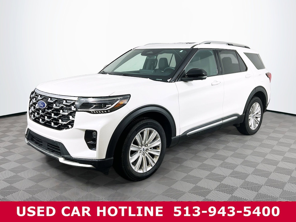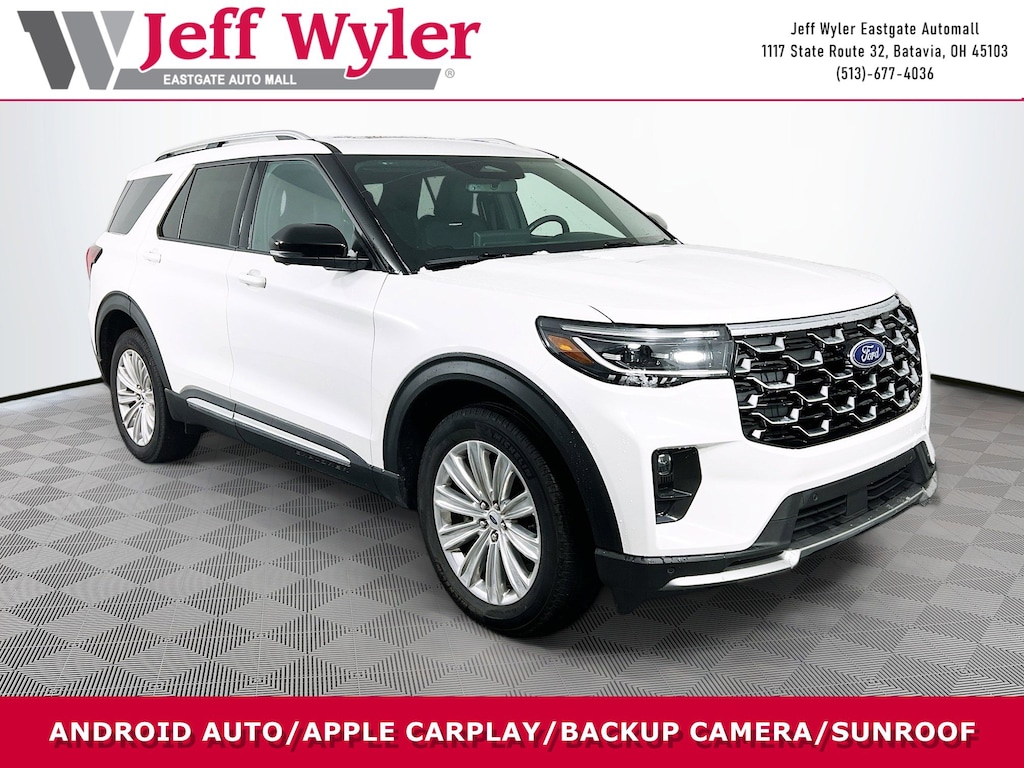 Jeff Wyler Eastgate Auto Mall is delighted to offer this gorgeous 2025 Ford Explorer Platinum in White Metallic. Well equipped with: Equipment Group 600A Standard Package, Lux Leather Package (Leather Seating Surfaces Sport Captain Chairs, Platinum Badges on Front Row Seats, Quilting & Stitching on Door Panels, and Quilting & Stitching on Seats), 14 Speakers, 3.58 Non-Limited Slip Rear Axle, 3rd row seats: bench, 4-Wheel Disc Brakes, ABS brakes, ActiveX Trimmed Sport Captain's Chairs, Air Conditioning, Alloy wheels, AM/FM radio: SiriusXM with 360L, Apple CarPlay/Android Auto, Auto High-beam Headlights, Auto-dimming door mirrors, Auto-dimming Rear-View mirror, Automatic temperature control, Brake assist, Bumpers: body-color, Compass, Delay-off headlights, Driver door bin, Driver vanity mirror, Dual front impact airbags, Dual front side impact airbags, Electronic Stability Control, Emergency communication system: 911 Assist, Exterior Parking Camera Rear, Four wheel independent suspension, Front & 2nd Rows Floor Liners w/Carpet Floor Mats, Front anti-roll bar, Front Bucket Seats, Front Center Armrest, Front dual zone A/C, Front fog lights, Front reading lights, Fully automatic headlights, Garage door transmitter, Heated door mirrors, Heated front seats, Heated rear seats, Heated steering wheel, Illuminated entry, Knee airbag, Leather steering wheel, Low tire pressure warning, Memory seat, Navigation System, Occupant sensing airbag, Outside temperature display, Overhead airbag, Overhead console, Panic alarm, Passenger door bin, Passenger vanity mirror, Power door mirrors, Power driver seat, Power Liftgate, Power moonroof, Power passenger seat, Power steering, Power windows, Radio data system, Radio: B&O Sound System by Bang & Olufsen w/HD, Rain sensing wipers, Rear air conditioning, Rear anti-roll bar, Rear reading lights, Rear window defroster, Rear window wiper, Remote keyless entry, Security system, Speed control, Speed-sensing steering, Speed-Sensitive Wipers, Split folding rear seat, Spoiler, Steering wheel mounted audio controls, Tachometer, Telescoping steering wheel, Tilt steering wheel, Traction control, Trip computer, Turn signal indicator mirrors, Variably intermittent wipers, Ventilated front seats, Wheels: 20" 10-Spoke Aluminum (DISC), and Wheels: 20" Luster Nickel-Painted Aluminum. CARFAX One-Owner. Clean CARFAX. Ask about available certifications. Used vehicles 10 years of age or newer with less than 100,000 miles are eligible for the Wyler Assurance Program, but eligible vehicles must pass our reconditioning process and multi-point inspection. Provided the vehicle passes inspection, vehicles will be eligible for the 6 month/6,000 mile limited warranty. The 6 month/6,000 mile limited warranty is NOT available on AS-IS vehicles, wholesale vehicles, lease buyback/pass-thru vehicles or un-inspected vehicles. Note that this program can also apply to vehicles where the remaining factory coverage is less than 6 months or 6,000 miles. Please check the Federal Trade Commission (FTC) Buyers guide on the vehicle for full details as to whether or not warranty coverage may apply. Contact Dealer for additional details. The Wyler Assurance 6 month/6,000 Mile limited warranty ends 6 months from the date of the Retail Purchase Agreement (BUYERS ORDER) or when the vehicle's odometer registers 6,000 additional miles to the mileage listed on the BUYERS ORDER, whichever comes first. Your Deductible - The warranty holder on your contract pays the first $100 of each covered repair.