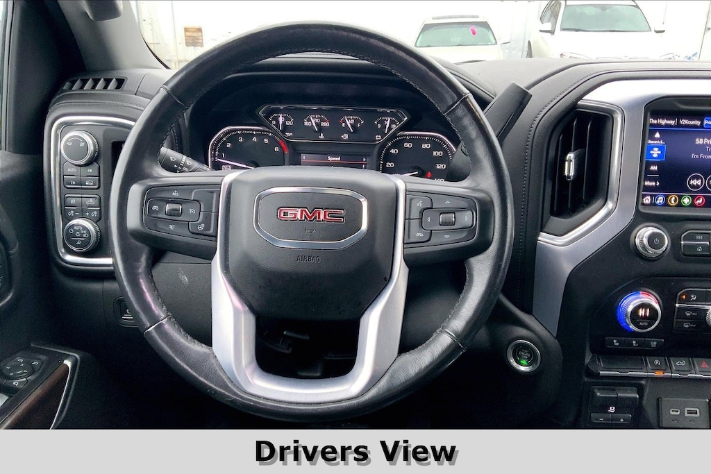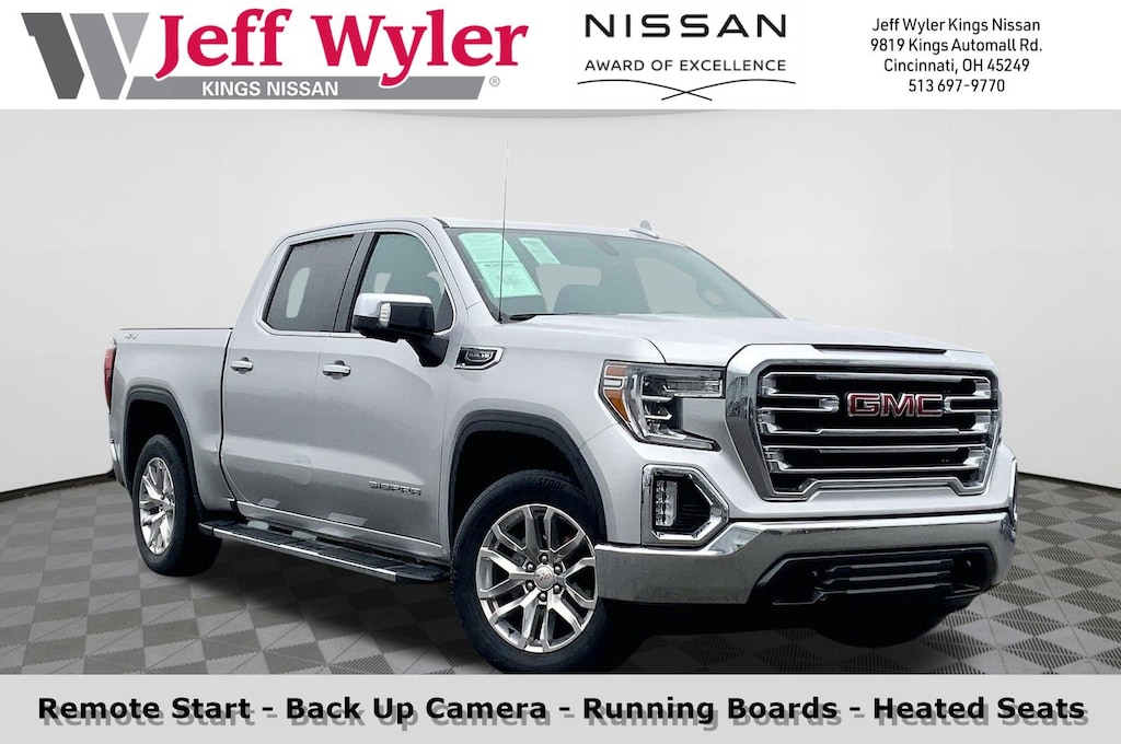 Jeff Wyler Kings Nissan is excited to offer this handsome 2019 GMC Sierra 1500 SLT in Quicksilver Metallic. Well equipped with: Preferred Equipment Group 4SA (12-Volt Rear Auxiliary Power Outlet, 120-Volt Bed Mounted Power Outlet, 120-Volt Instrument Panel Power Outlet, 170 Amp Alternator, Auxiliary External Transmission Oil Cooler, Chrome Grille, Color-Keyed Carpeting Floor Covering, Compass, Deep-Tinted Glass, Electric Rear-Window Defogger, Electrical Lock Control Steering Column, Front Frame-Mounted Black Recovery Hooks, GMC 4G LTE, GMC Connected Access, HD Radio, Heated Driver & Front Passenger Seating, Heavy-Duty Rear Locking Differential, Hitch Guidance, Hitch Guidance w/Hitch View, In-Vehicle Trailering App, Integrated Trailer Brake Controller, Keyless Open & Start, LED Cargo Area Lighting, Manual Tilt-Wheel & Telescoping Steering Column, OnStar & GMC Connected Services Capable, Power Door Locks, Power Front Passenger Windows w/Express Up/Down, Power Front Windows w/Driver Express Up/Down, Power Rear Windows w/Express Down, Rear Dual USB Charging-Only Ports, Rear Wheelhouse Liners, Remote Vehicle Starter System, Steering Wheel Audio Controls, and Theft Deterrent System (Unauthorized Entry)), SLT Convenience Package (2 USB Ports, 2 USB Ports (1st Row), Floor Mounted Console, Front Bucket Seats, Heated 2nd Row Outboard Seats, Power Sliding Rear Window w/Rear Defogger, Universal Home Remote, and Ventilated Driver & Front Passenger Seats), SLT Premium Package (Chrome Assist Steps), Trailering Package, 8-Speed Automatic, 4WD, Jet Black Leather, 10-Way Power Driver Seat Adjuster w/Lumbar, 10-Way Power Passenger Seat Adjuster w/Lumbar, 20" x 9" Polished Aluminum Wheels, 3.23 Rear Axle Ratio, 4-Wheel Disc Brakes, 6 Speakers, 6-Speaker Audio System Feature, ABS brakes, Air Conditioning, Alloy wheels, AM/FM radio: SiriusXM, Apple CarPlay/Android Auto, Auto-dimming door mirrors, Auto-dimming Rear-View mirror, Automatic temperature control, Brake assist, Bumpers: chrome, Delay-off headlights, Driver door bin, Driver Memory, Driver vanity mirror, Dual front impact airbags, Dual front side impact airbags, Electronic Stability Control, Front 40/20/40 Split-Bench Seat, Front anti-roll bar, Front Center Armrest w/Storage, Front dual zone A/C, Front fog lights, Front License Plate Kit, Front reading lights, Front wheel independent suspension, Fully automatic headlights, Heated door mirrors, Heated front seats, Heated steering wheel, Heavy Duty Suspension, Illuminated entry, Low tire pressure warning, Memory seat, Occupant sensing airbag, Outside temperature display, Overhead airbag, Overhead console, Panic alarm, Passenger door bin, Passenger vanity mirror, Perforated Leather-Appointed Seat Trim, Power door mirrors, Power driver seat, Power passenger seat, Power steering, Power windows, Premium audio system: GMC Infotainment System, Radio data system, Radio: Premium GMC Infotainment Sys w/Multi-Touch, Rear reading lights, Rear seat center armrest, Rear step bumper, Rear window defroster, Remote keyless entry, Security system, SiriusXM Radio, Speed control, Speed-sensing steering, Split folding rear seat, Spray-On Pickup Bed Liner w/GMC Logo, Steering wheel mounted audio controls, Tachometer, Telescoping steering wheel, Tilt steering wheel, Traction control, Trip computer, Variably intermittent wipers, Voltmeter, and Wheels: 18" x 8.5" 6-Spoke Machined Aluminum.Ask about available certifications.
