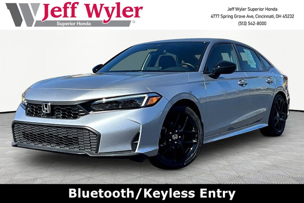 Jeff Wyler Superior Honda is very proud to offer this beautiful 2025 Honda Civic Sport in Solar Silver Metallic. BLUETOOTH, CLEAN CARFAX...NO ACCIDENTS, HONDA CERTIFIED!, REMAINDER OF FACTORY WARRANTY, RECENT SUPERIOR TRADE, BOUGHT, SERVICED AND TRADED AT SUPERIOR, and ONE OWNER Civic Sport, HondaTrue Certified Certified, 4D Sedan, 2.0L I4 DOHC 16V, CVT, FWD, Solar Silver Metallic, 4-Wheel Disc Brakes, 8 Speakers, ABS brakes, Adaptive Cruise Control: Adaptive Cruise Control (ACC) with Low-Speed Follow, Air Conditioning, Alloy wheels, AM/FM radio, Apple CarPlay/Android Auto, Auto High-beam Headlights, Automatic temperature control, Blind Spot Information (BSI) System warning, Brake assist, Bumpers: body-color, Cloth/Leatherette Seating Surfaces, Delay-off headlights, Driver door bin, Driver vanity mirror, Dual front impact airbags, Dual front side impact airbags, Electronic Stability Control, Emergency communication system: HondaLink, Exterior Parking Cameras, Four wheel independent suspension, Front anti-roll bar, Front Bucket Seats, Front Center Armrest, Front reading lights, Fully automatic headlights, Heated door mirrors, Illuminated entry, Knee airbag, Leather Shift Knob, Leather steering wheel, Low tire pressure warning, Occupant sensing airbag, Outside temperature display, Overhead airbag, Panic alarm, Passenger door bin, Passenger vanity mirror, Power door mirrors, Power steering, Power windows, Radio data system, Radio: 180-Watt Audio System, Rear anti-roll bar, Rear seat center armrest, Rear side impact airbag, Rear window defroster, Remote keyless entry, Security system, Speed control, Speed-sensing steering, Split folding rear seat, Steering wheel mounted audio controls, Tachometer, Telescoping steering wheel, Tilt steering wheel, Traction control, Trip computer, and Wheels: 18" Gloss Black Alloy Our PRE-OWNED vehicles are put through a rigorous 167- POINT QUALITY ASSURANCE INSPECTION along with an average amount of over $1,400.00 SPENT to recondition each vehicle so we can be sure to deliver you the highest quality vehicle like you deserve! ***ONLINE PRICE DOES NOT INCLUDE WYLER FAMILY FIRST PACKAGE*** Stop by 4777 Spring Grove Ave. Road to see for yourself, or give us a call @ 283-209-1858 to schedule your test drive!Vehicle pricing includes all offers and incentives. Due to limited inventory, offers and pricing are all subject to change. Tax, Title, Tags and $387 doc fees are not included in vehicle price shown and must be paid by the purchaser. Doc fees vary by location. Financing w/approved credit. Mileage est. Based on current EPA estimates reflecting new EPA methods beginning w/ 2008 models. For comparison only. Do not compare to pre 2008 models. Actual mileage may vary based on how you drive and maintain your vehicle. Information on this site includes 3rd party data believed to be reliable, subject to change without notice. Jeff Wyler reserves the right to correct any errors and/or omissions in the compilation or presentation of this data and makes no representations express or implied to any prospective purchaser as to the vehicle's condition, specifications, history, equipment or equipment function, price or warranties. This vehicle may be subject to an open recall that has not been repaired. Please consult safercar.gov for more information on the current status. It is the responsibility of purchaser to confirm any data prior to purchase. Other than MSRP, all offers only apply to this vehicle and are subject to change. Vehicle prices are subject to change and all vehicles are subject to prior sale and may not be available when you are ready to purchase. Prices listed on any other website may not be accepted. Dealership advertises the sale of vehicles through a number of different channels and cannot always control when they are updated. Wyler? and Jeff Wyler? are registered trademarks of the Jeff Wyler Automotive Family, Inc.