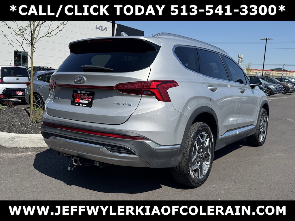 Jeff Wyler Kia of Colerain is proud to offer this good-looking 2022 Hyundai Santa Fe Hybrid Limited in Shimmering Silver. Cargo Package (Cargo Net, Cargo Tray, and First Aid Kit), Option Group 01, 12 Speakers, 3.510 Axle Ratio, 4-Wheel Disc Brakes, ABS brakes, Air Conditioning, Alloy wheels, AM/FM radio: SiriusXM, Apple CarPlay & Android Auto, Auto High-beam Headlights, Auto-dimming Rear-View mirror, Automatic temperature control, Brake assist, Bumper Applique, Bumpers: body-color, Cargo Cover/Screen, Carpeted Floor Mats, Delay-off headlights, Driver door bin, Driver vanity mirror, Dual front impact airbags, Dual front side impact airbags, Electronic Stability Control, Emergency communication system, Four wheel independent suspension, Front anti-roll bar, Front Bucket Seats, Front Center Armrest, Front dual zone A/C, Front reading lights, Fully automatic headlights, Garage door transmitter: HomeLink, harman/kardon® Speakers, Heated & Ventilated Front Bucket Seats, Heated door mirrors, Heated front seats, Heated rear seats, Heated steering wheel, Illuminated entry, Leather Seat Trim, Leather steering wheel, Low tire pressure warning, Memory seat, Navigation System, Occupant sensing airbag, Outside temperature display, Overhead airbag, Overhead console, Panic alarm, Passenger door bin, Passenger vanity mirror, Power door mirrors, Power driver seat, Power Liftgate, Power moonroof, Power passenger seat, Power steering, Power windows, Radio: AM/FM Harman Kardon Audio, Rain sensing wipers, Rear anti-roll bar, Rear seat center armrest, Rear window defroster, Rear window wiper, Remote keyless entry, Security system, Speed control, Speed-sensing steering, Split folding rear seat, Spoiler, Steering wheel mounted audio controls, Tachometer, Telescoping steering wheel, Tilt steering wheel, Traction control, Trip computer, Turn signal indicator mirrors, Variably intermittent wipers, Ventilated front seats, and Wheels: 19" x 7.5J Alloy Our PRE-OWNED vehicles are put through a rigorous 167- POINT QUALITY ASSURANCE INSPECTION along with an average amount of over $1,400.00 SPENT to recondition each vehicle so we can be sure to deliver you the highest quality vehicle like you deserve! ***ONLINE PRICE DOES NOT INCLUDE WYLER FAMILY FIRST PACKAGE***