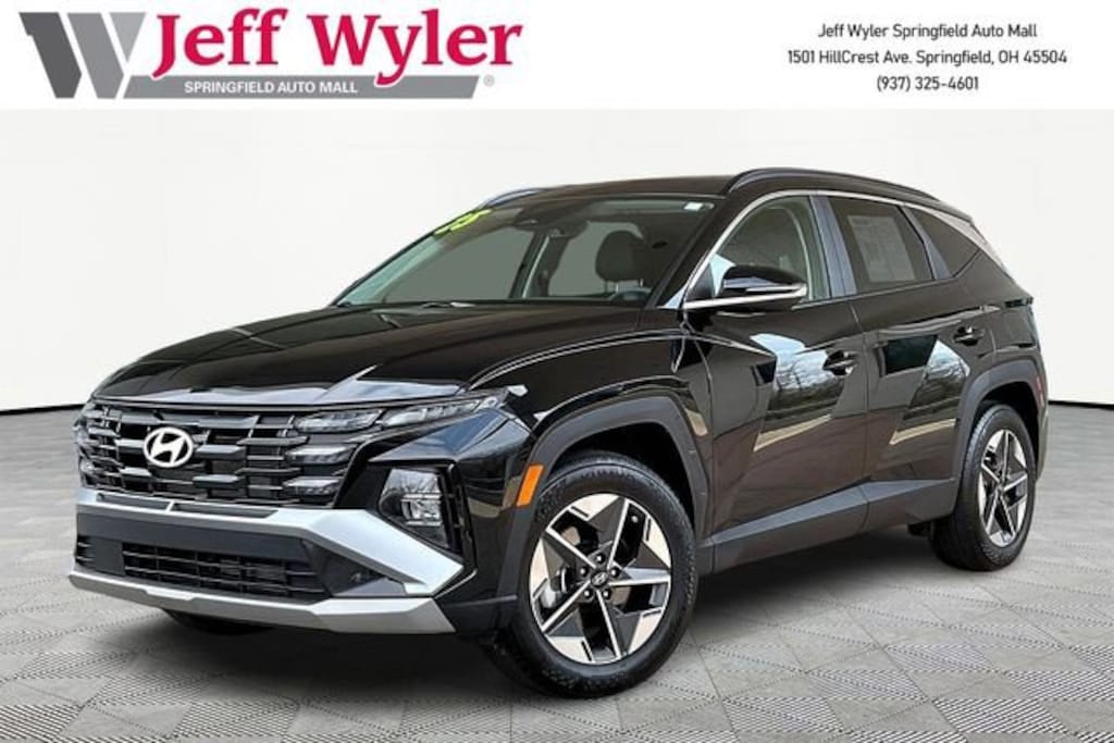Jeff Wyler Springfield Auto Mall is honored to offer this gorgeous 2025 Hyundai Tucson SEL Convenience in Phantom Black. Well equipped with: Option Group 01, 18 Alloy Wheels, 4-Wheel Disc Brakes, 6 Speakers, ABS brakes, Air Conditioning, Alloy wheels, AM/FM radio: SiriusXM, Apple CarPlay & Android Auto, Auto High-beam Headlights, Auto-dimming Rear-View mirror, Automatic temperature control, Brake assist, Bumpers: body-color, Cargo Tray, Carpeted Floor Mats, Delay-off headlights, Driver door bin, Driver vanity mirror, Dual front impact airbags, Dual front side impact airbags, Electronic Stability Control, Emergency communication system: Bluelink+, First Aid Kit, Four wheel independent suspension, Front anti-roll bar, Front Bucket Seats, Front Center Armrest, Front dual zone A/C, Front reading lights, Fully automatic headlights, H-Tex Seat Trim, Heated door mirrors, Heated Front Bucket Seats, Heated front seats, Illuminated entry, Leather steering wheel, Low tire pressure warning, Navigation System, Occupant sensing airbag, Outside temperature display, Overhead airbag, Overhead console, Panic alarm, Passenger door bin, Passenger vanity mirror, Power door mirrors, Power driver seat, Power Liftgate, Power moonroof, Power steering, Power windows, Radio data system, Radio: AM/FM/HD Audio System, Rear anti-roll bar, Rear reading lights, Rear seat center armrest, Rear side impact airbag, Rear window defroster, Rear window wiper, Remote keyless entry, Security system, Speed control, Split folding rear seat, Spoiler, Steering wheel mounted audio controls, Tachometer, Telescoping steering wheel, Tilt steering wheel, Tow Hitch, Traction control, Trip computer, Turn signal indicator mirrors, and Variably intermittent wipers. Ask about available certifications. Used vehicles 10 years of age or newer with less than 100,000 miles are eligible for the Wyler Assurance Program, but eligible vehicles must pass our reconditioning process and multi-point inspection. Provided the vehicle passes inspection, vehicles will be eligible for the 6 month/6,000 mile limited warranty. The 6 month/6,000 mile limited warranty is NOT available on AS-IS vehicles, wholesale vehicles, lease buyback/pass-thru vehicles or un-inspected vehicles. Note that this program can also apply to vehicles where the remaining factory coverage is less than 6 months or 6,000 miles. Please check the Federal Trade Commission (FTC) Buyers guide on the vehicle for full details as to whether or not warranty coverage may apply. Contact Dealer for additional details. The Wyler Assurance 6 month/6,000 Mile limited warranty ends 6 months from the date of the Retail Purchase Agreement (BUYERS ORDER) or when the vehicle's odometer registers 6,000 additional miles to the mileage listed on the BUYERS ORDER, whichever comes first. Your Deductible - The warranty holder on your contract pays the first $100 of each covered repair.