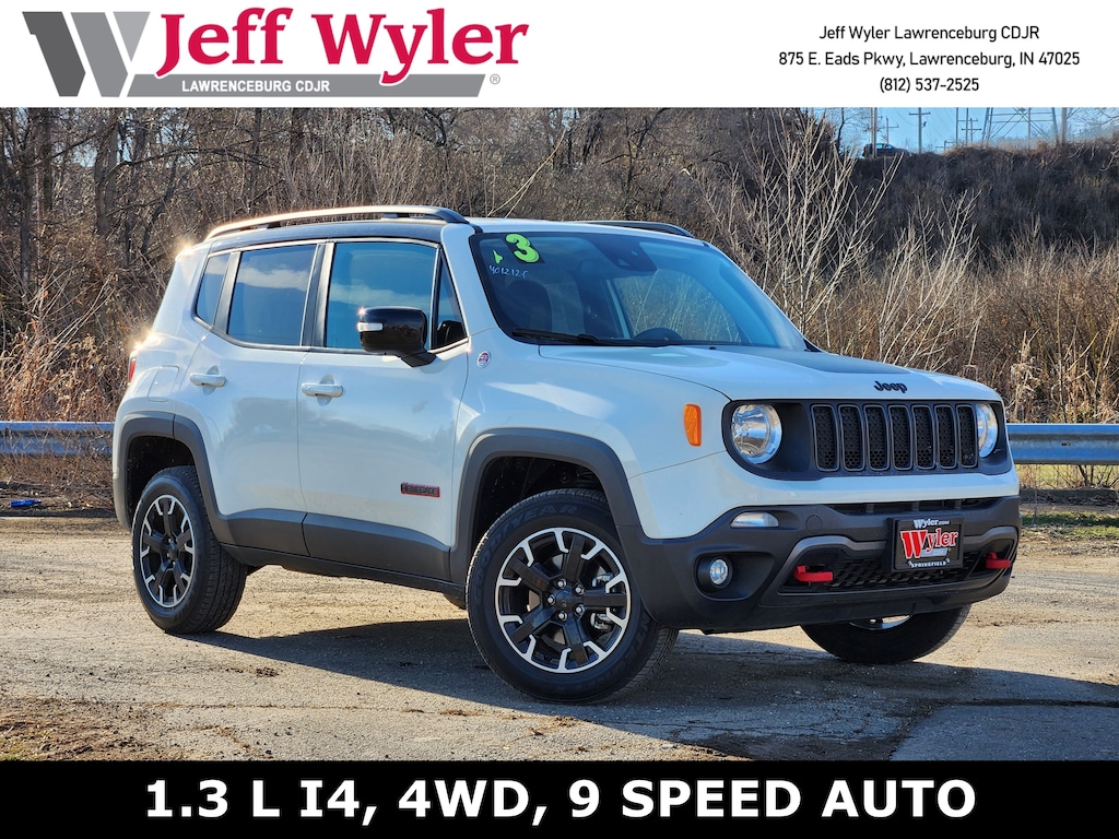 Jeff Wyler Chrysler Dodge Jeep of Lawrenceburg is excited to offer this gorgeous 2023 Jeep Renegade Trailhawk in Alpine White Clearcoat. Quick Order Package 22C, 4-Wheel Disc Brakes, 4.585 Final Drive Ratio, 6 Speakers, ABS brakes, Air Conditioning, Alloy wheels, AM/FM radio: SiriusXM, Anti-whiplash front head restraints, Apple CarPlay/Android Auto, Auto-dimming Rear-View mirror, Automatic temperature control, Brake assist, Compass, Delay-off headlights, Driver door bin, Driver vanity mirror, Dual front impact airbags, Dual front side impact airbags, Electronic Stability Control, Emergency communication system: SiriusXM Guardian, Four wheel independent suspension, Front anti-roll bar, Front Bucket Seats, Front Center Armrest, Front dual zone A/C, Front fog lights, Front reading lights, Fully automatic headlights, Heated door mirrors, Illuminated entry, Knee airbag, Leather Shift Knob, Leather steering wheel, Low tire pressure warning, Navigation System, Normal Duty Suspension, Occupant sensing airbag, Outside temperature display, Overhead airbag, Panic alarm, ParkView Rear Back-Up Camera, Passenger door bin, Passenger vanity mirror, Power door mirrors, Power steering, Power windows, Premium Cloth Low-Back Bucket Seats, Radio data system, Radio: Uconnect 4C Nav w/8.4" Display, Rain sensing wipers, Rear anti-roll bar, Rear window defroster, Rear window wiper, Remote keyless entry, Roof rack: rails only, Security system, Speed control, Split folding rear seat, Spoiler, Steering wheel mounted audio controls, Tachometer, Telescoping steering wheel, Tilt steering wheel, Traction control, Trip computer, Turn signal indicator mirrors, Variably intermittent wipers, Voltmeter, and Wheels: 17" x 7" Glossy Black Diamond Cut Our PRE-OWNED vehicles are put through a rigorous 167- POINT QUALITY ASSURANCE INSPECTION along with an average amount of over $1,400.00 SPENT to recondition each vehicle so we can be sure to deliver you the highest quality vehicle like you deserve! ***ONLINE PRICE DOES NOT INCLUDE WYLER FAMILY FIRST PACKAGE*** Stop by 4136 Shelbyville Road to see for yourself, or give us a call @ 502-897-3151 to schedule your test drive! Ask about available certifications.