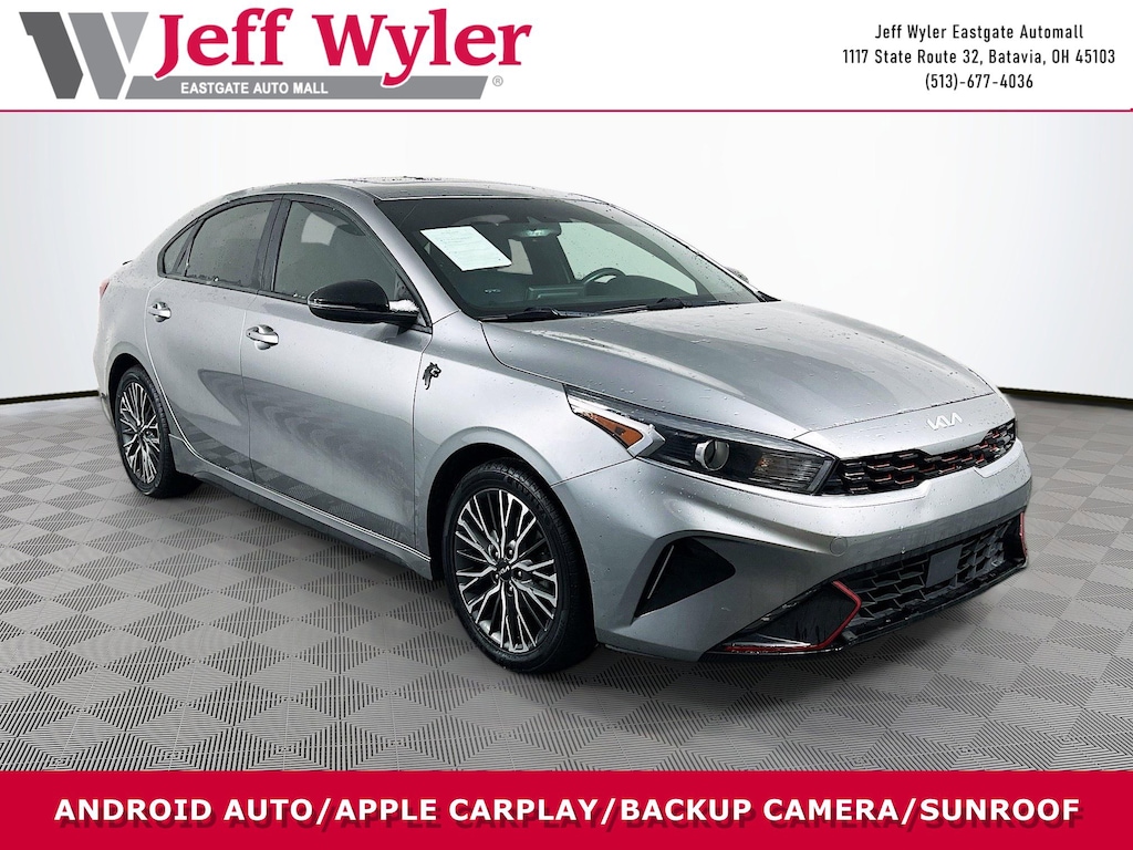 Jeff Wyler Eastgate Auto Mall is delighted to offer this good-looking 2022 Kia Forte GT-Line in Steel Gray. Well equipped with: GT-Line Premium Package (Electronic Parking Brake (EPB) w/Auto Hold, Forward Collision Avoidance-Assist - Cyclist, Highway Driving Assist (HDA), Navigation-Based Smart Cruise Control (NSCC), Overhead LED Front & Rear Reading Lamps, Power Sunroof, Radio: AM/FM/MP3 harman/kardon Premium Audio System, Smart Cruise Control, and Wireless Charging), GT-Line Sport Premium Package (10-Way Power Driver's Seat, Heated & Ventilated Front Seats, Rear AC Vent, Rear USB Charger, and SynTex Seat Trim), 4-Wheel Disc Brakes, 6 Speakers, ABS brakes, Air Conditioning, Alloy wheels, AM/FM radio: SiriusXM, Apple CarPlay & Android Auto, Auto High-beam Headlights, Automatic temperature control, Brake assist, Bumpers: body-color, Cloth & Leatherette Seat Trim, Delay-off headlights, Driver door bin, Driver vanity mirror, Dual front impact airbags, Dual front side impact airbags, Electronic Stability Control, Emergency communication system: UVO eServices, Exterior Parking Camera Rear, Front anti-roll bar, Front Bucket Seats, Front Center Armrest, Front dual zone A/C, Front fog lights, Front reading lights, Front Sport Seats, Front wheel independent suspension, Fully automatic headlights, Heated door mirrors, Illuminated entry, Leather Shift Knob, Leather steering wheel, Low tire pressure warning, Navigation System, Occupant sensing airbag, Outside temperature display, Overhead airbag, Overhead console, Panic alarm, Passenger door bin, Passenger vanity mirror, Power door mirrors, Power steering, Power windows, Radio data system, Radio: UVO Link Audio System, Rear seat center armrest, Rear window defroster, Remote keyless entry, Security system, Speed control, Split folding rear seat, Spoiler, Sport steering wheel, Steering wheel mounted audio controls, Tachometer, Telescoping steering wheel, Tilt steering wheel, Traction control, Trip computer, Turn signal indicator mirrors, Variably intermittent wipers, and Wheels: 17" Graphite Finish Alloy. Ask about available certifications. Used vehicles 10 years of age or newer with less than 100,000 miles are eligible for the Wyler Assurance Program, but eligible vehicles must pass our reconditioning process and multi-point inspection. Provided the vehicle passes inspection, vehicles will be eligible for the 6 month/6,000 mile limited warranty. The 6 month/6,000 mile limited warranty is NOT available on AS-IS vehicles, wholesale vehicles, lease buyback/pass-thru vehicles or un-inspected vehicles. Note that this program can also apply to vehicles where the remaining factory coverage is less than 6 months or 6,000 miles. Please check the Federal Trade Commission (FTC) Buyers guide on the vehicle for full details as to whether or not warranty coverage may apply. Contact Dealer for additional details. The Wyler Assurance 6 month/6,000 Mile limited warranty ends 6 months from the date of the Retail Purchase Agreement (BUYERS ORDER) or when the vehicle's odometer registers 6,000 additional miles to the mileage listed on the BUYERS ORDER, whichever comes first. Your Deductible - The warranty holder on your contract pays the first $100 of each covered repair.