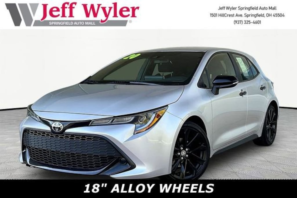 Jeff Wyler Springfield Auto Mall is honored to offer this wonderful 2020 Toyota Corolla Hatchback SE Nightshade Edition in Classic Silver Metallic. Well equipped with: 4-Wheel Disc Brakes, 6 Speakers, ABS brakes, Air Conditioning, Alloy wheels, AM/FM radio: SiriusXM, Apple CarPlay/Android Auto, Auto High-beam Headlights, Automatic temperature control, Brake assist, Bumpers: body-color, Compass, Delay-off headlights, Driver door bin, Driver vanity mirror, Dual front impact airbags, Dual front side impact airbags, Electronic Stability Control, Emergency communication system: Safety Connect with 1-year trial, Exterior Parking Camera Rear, Fabric Upholstery, Four wheel independent suspension, Front anti-roll bar, Front Bucket Seats, Front Center Armrest, Front reading lights, Heated door mirrors, Illuminated entry, Knee airbag, Leather Shift Knob, Low tire pressure warning, Occupant sensing airbag, Outside temperature display, Overhead airbag, Overhead console, Panic alarm, Passenger door bin, Passenger vanity mirror, Power door mirrors, Power steering, Power windows, Radio data system, Radio: Audio AM/FM, Rear anti-roll bar, Rear seat center armrest, Rear window defroster, Rear window wiper, Remote keyless entry, Security system, Speed control, Speed-sensing steering, Split folding rear seat, Spoiler, Sport Front Seats, Steering wheel mounted audio controls, Tachometer, Telescoping steering wheel, Tilt steering wheel, Traction control, Trip computer, Turn signal indicator mirrors, and Variably intermittent wipers. Ask about available certifications. Used vehicles 10 years of age or newer with less than 100,000 miles are eligible for the Wyler Assurance Program, but eligible vehicles must pass our reconditioning process and multi-point inspection. Provided the vehicle passes inspection, vehicles will be eligible for the 6 month/6,000 mile limited warranty. The 6 month/6,000 mile limited warranty is NOT available on AS-IS vehicles, wholesale vehicles, lease buyback/pass-thru vehicles or un-inspected vehicles. Note that this program can also apply to vehicles where the remaining factory coverage is less than 6 months or 6,000 miles. Please check the Federal Trade Commission (FTC) Buyers guide on the vehicle for full details as to whether or not warranty coverage may apply. Contact Dealer for additional details. The Wyler Assurance 6 month/6,000 Mile limited warranty ends 6 months from the date of the Retail Purchase Agreement (BUYERS ORDER) or when the vehicle's odometer registers 6,000 additional miles to the mileage listed on the BUYERS ORDER, whichever comes first. Your Deductible - The warranty holder on your contract pays the first $100 of each covered repair.