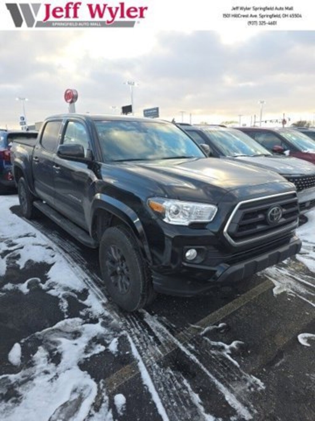 Jeff Wyler Springfield Auto Mall is honored to offer this attractive 2023 Toyota Tacoma SR5 in Black. Well equipped with: ABS brakes, Active Cruise Control, Alloy wheels, Electronic Stability Control, Front dual zone A/C, Heated door mirrors, Illuminated entry, Low tire pressure warning, Remote keyless entry, Traction control, 6 Speakers, Air Conditioning, AM/FM radio: SiriusXM, Anti-whiplash front head restraints, Apple CarPlay/Android Auto, Auto High-beam Headlights, Auto-dimming Rear-View mirror, Automatic temperature control, Axle Ratio: 3.91, Black Headlamp Bezel, Brake assist, Bumpers: body-color, Daytime Running Lamps, Driver door bin, Dual front impact airbags, Dual front side impact airbags, Emergency communication system: Safety Connect (1-year trial), Exterior Parking Camera Rear, Fabric Seat Trim, Front anti-roll bar, Front Bucket Seats, Front Center Armrest, Front fog lights, Front reading lights, Front Seats, Front wheel independent suspension, Knee airbag, Occupant sensing airbag, Outside temperature display, Overhead airbag, Overhead console, Panic alarm, Passenger door bin, Power door mirrors, Power driver seat, Power steering, Power windows, Radio: Audio, Rear step bumper, Speed control, Speed-sensing steering, Split folding rear seat, Steering wheel mounted audio controls, Tachometer, Telescoping steering wheel, Tilt steering wheel, Trip computer, Variably intermittent wipers, and Wheels: 16 Dark Gray Alloy. Ask about available certifications. Used vehicles 10 years of age or newer with less than 100,000 miles are eligible for the Wyler Assurance Program, but eligible vehicles must pass our reconditioning process and multi-point inspection. Provided the vehicle passes inspection, vehicles will be eligible for the 6 month/6,000 mile limited warranty. The 6 month/6,000 mile limited warranty is NOT available on AS-IS vehicles, wholesale vehicles, lease buyback/pass-thru vehicles or un-inspected vehicles. Note that this program can also apply to vehicles where the remaining factory coverage is less than 6 months or 6,000 miles. Please check the Federal Trade Commission (FTC) Buyers guide on the vehicle for full details as to whether or not warranty coverage may apply. Contact Dealer for additional details. The Wyler Assurance 6 month/6,000 Mile limited warranty ends 6 months from the date of the Retail Purchase Agreement (BUYERS ORDER) or when the vehicle's odometer registers 6,000 additional miles to the mileage listed on the BUYERS ORDER, whichever comes first. Your Deductible - The warranty holder on your contract pays the first $100 of each covered repair.