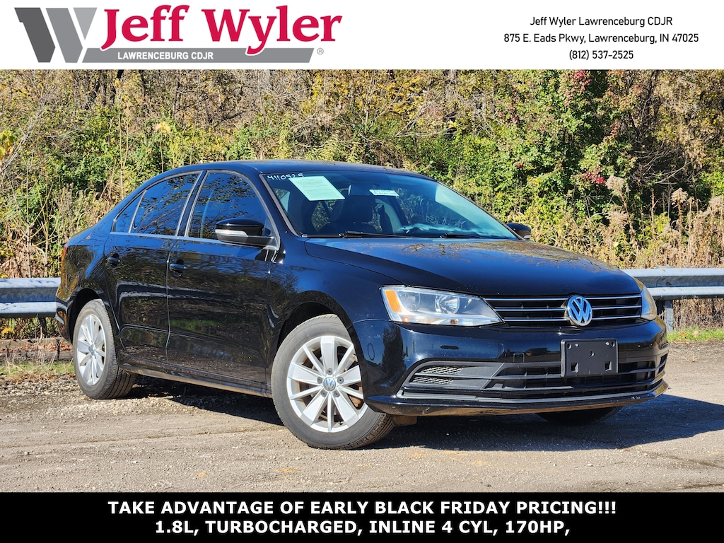 Jeff Wyler Chrysler Dodge Jeep of Lawrenceburg is honored to offer this attractive 2015 Volkswagen Jetta 1.8T SE in Black. Titan Black Premium Synthetic, 4-Wheel Disc Brakes, 6 Speakers, ABS brakes, Air Conditioning, Alloy wheels, AM/FM radio: SiriusXM, Brake assist, Bumpers: body-color, CD player, Chrome Exhaust Tips, Driver door bin, Driver vanity mirror, Dual front impact airbags, Dual front side impact airbags, Electronic Stability Control, Front anti-roll bar, Front Bucket Seats, Front Center Armrest, Front reading lights, Front wheel independent suspension, Heated door mirrors, Heated front seats, Illuminated entry, Low tire pressure warning, Occupant sensing airbag, Outside temperature display, Overhead airbag, Overhead console, Panic alarm, Passenger door bin, Passenger vanity mirror, Power door mirrors, Power steering, Power windows, Radio data system, Rear anti-roll bar, Rear reading lights, Rear window defroster, Remote keyless entry, Roadside Assistance Kit, Rubber Mat Kit, Speed control, Speed-sensing steering, Split folding rear seat, Steering wheel mounted audio controls, Tachometer, Telescoping steering wheel, Tilt steering wheel, Traction control, Trip computer, and Variably intermittent wipers Our PRE-OWNED vehicles are put through a rigorous 167- POINT QUALITY ASSURANCE INSPECTION along with an average amount of over $1,400.00 SPENT to recondition each vehicle so we can be sure to deliver you the highest quality vehicle like you deserve! ***ONLINE PRICE DOES NOT INCLUDE WYLER FAMILY FIRST PACKAGE*** Stop by 4136 Shelbyville Road to see for yourself, or give us a call @ 502-897-3151 to schedule your test drive! Ask about available certifications.