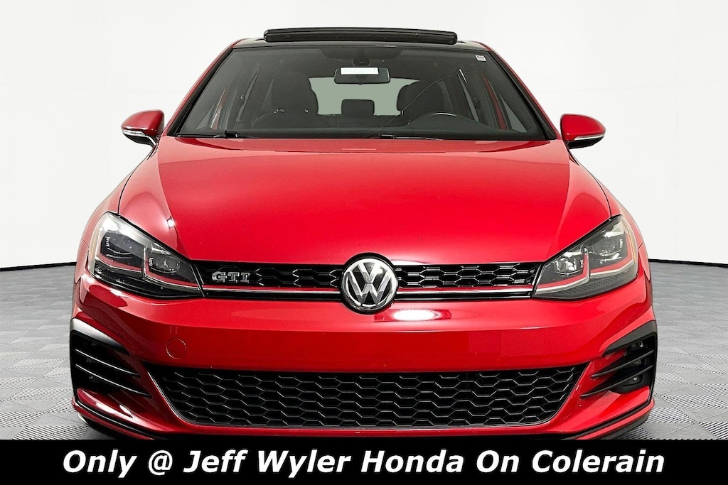 Jeff Wyler Honda of Colerain is excited to offer this good-looking 2018 Volkswagen Golf GTI 2.0T SE in Tornado Red. Well equipped with: ABS brakes, Alloy wheels, Compass, Electronic Stability Control, Heated door mirrors, Heated front seats, Heated Top Sport Front Seats, Illuminated entry, Low tire pressure warning, Power moonroof, Remote keyless entry, Traction control, 4-Wheel Disc Brakes, 8 Speakers, Air Conditioning, AM/FM radio: SiriusXM, Anti-whiplash front head restraints, Brake assist, Bumpers: body-color, CD player, Cloth Seating Surfaces, Delay-off headlights, Driver door bin, Driver vanity mirror, Dual front impact airbags, Dual front side impact airbags, Emergency communication system: VW Car-Net, Exterior Parking Camera Rear, Four wheel independent suspension, Front anti-roll bar, Front Bucket Seats, Front Center Armrest, Front fog lights, Front reading lights, Fully automatic headlights, Leather Shift Knob, Leather steering wheel, Occupant sensing airbag, Outside temperature display, Overhead airbag, Overhead console, Panic alarm, Passenger door bin, Passenger vanity mirror, Power door mirrors, Power driver seat, Power passenger seat, Power steering, Power windows, Radio data system, Radio: Composition Media w/8" Touchscreen, Rain sensing wipers, Rear anti-roll bar, Rear reading lights, Rear seat center armrest, Rear window defroster, Rear window wiper, Speed control, Speed-sensing steering, Speed-Sensitive Wipers, Split folding rear seat, Spoiler, Sport steering wheel, Steering wheel mounted audio controls, Tachometer, Telescoping steering wheel, Tilt steering wheel, Trip computer, Turn signal indicator mirrors, Variably intermittent wipers, and Wheels: 18" Dallas Alloy.